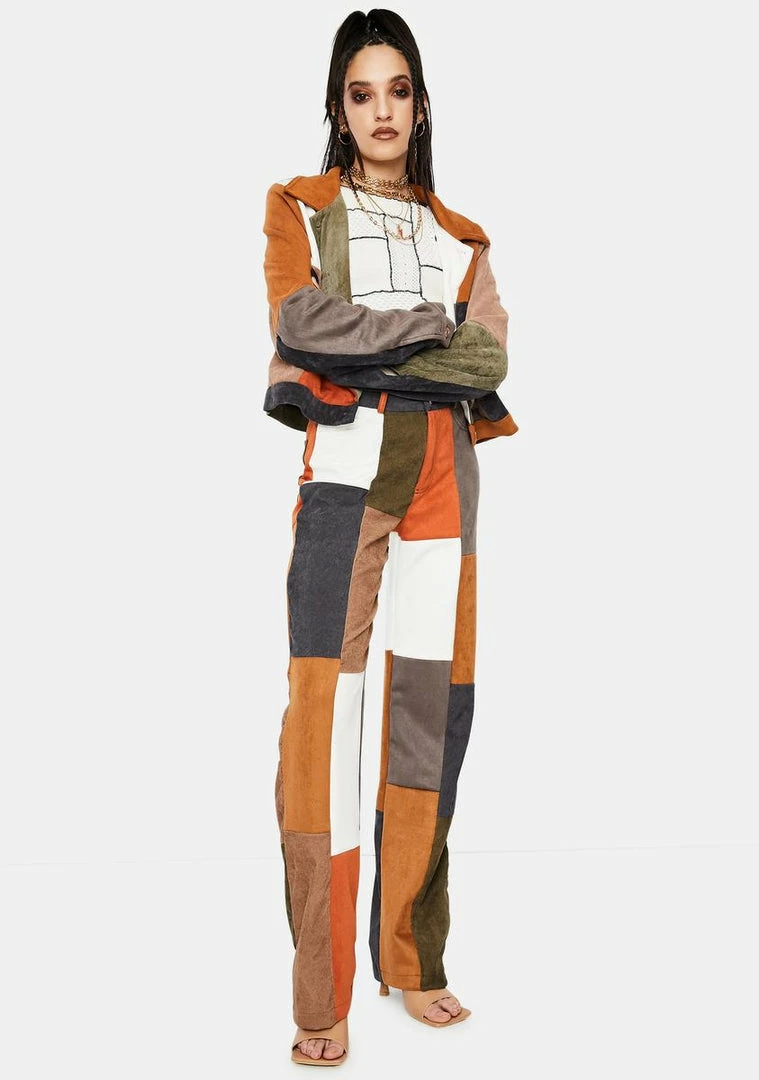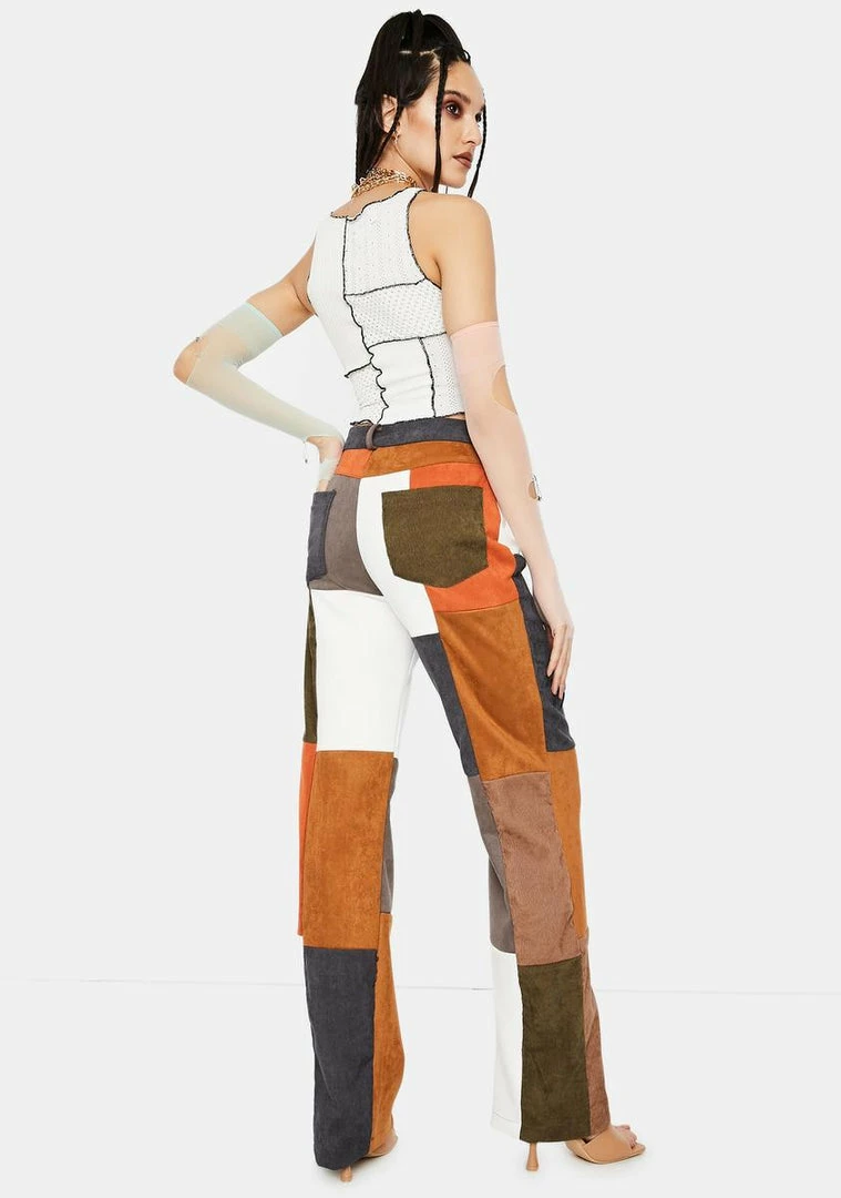 cuz the feelings are neutral. These wide leg trousers have a high waist fit, a mixed cord patchwork design, vegan suede and leather details, and pockets on the front and back.