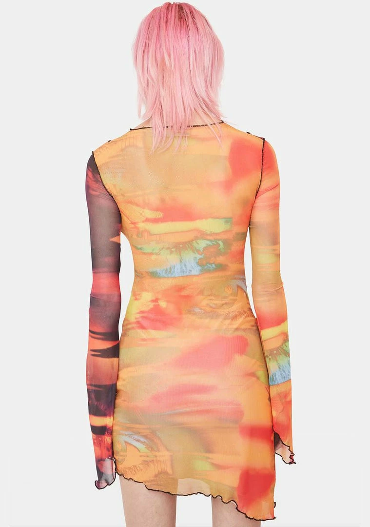 cuz youΓ’ΒΒre just an illusion, babe. This mesh mini dress has long sleeves with flared cuffs, contrast exposed stitching, a cut-out design with tie front details, and an abstract eye print all over.