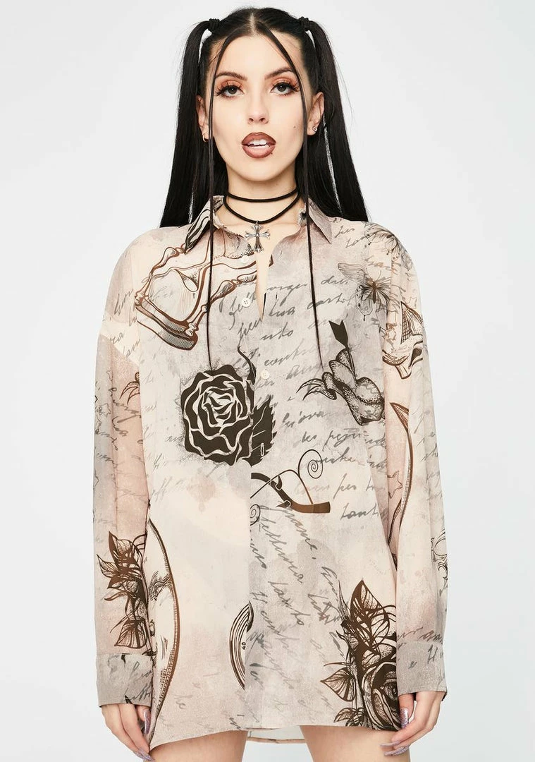 blame it on mercury retrograde, babe. You’re an icon in this semi-sheer chiffon button up shirt with an oversized fit and a mystic tattoo print all ova.