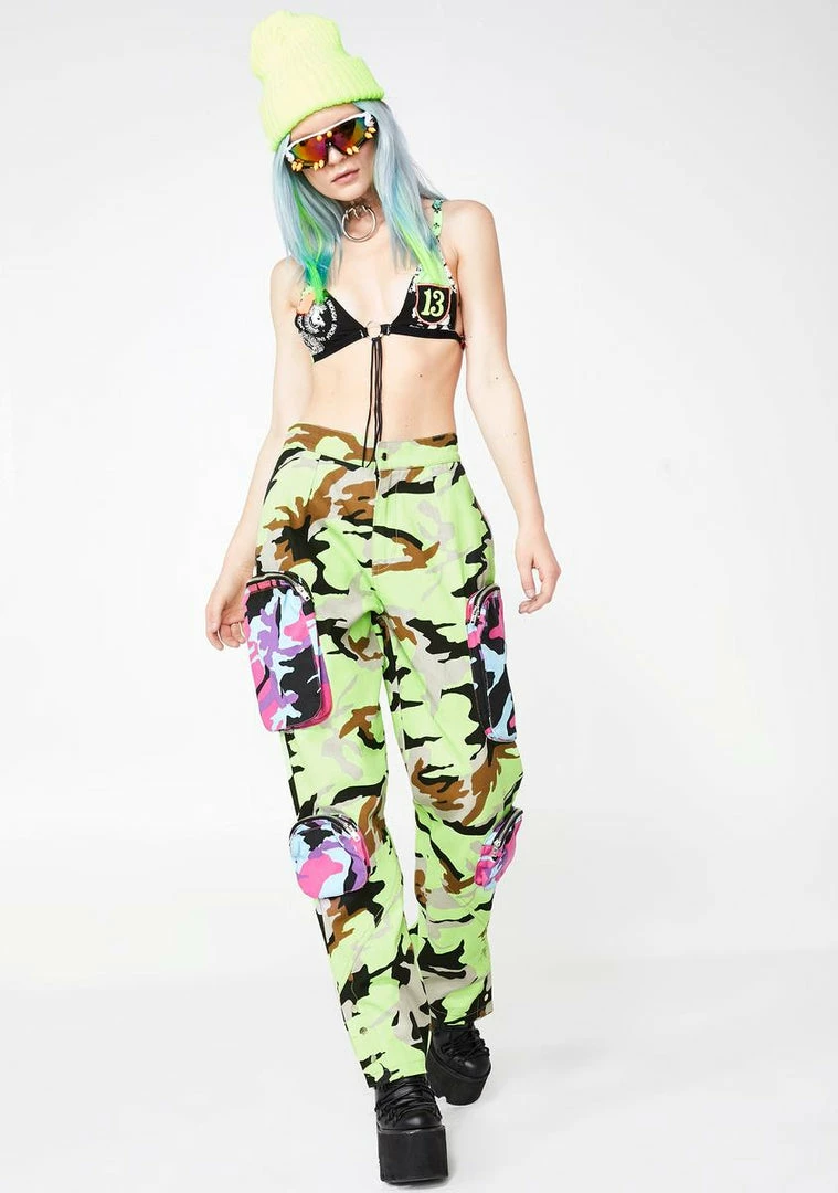 cuz youΓ’ΒΒre always ready for battle, baby! These sikk pants have a relaxed fit, allover neon camo print, contrasting cargo pockets and zip fly closure.