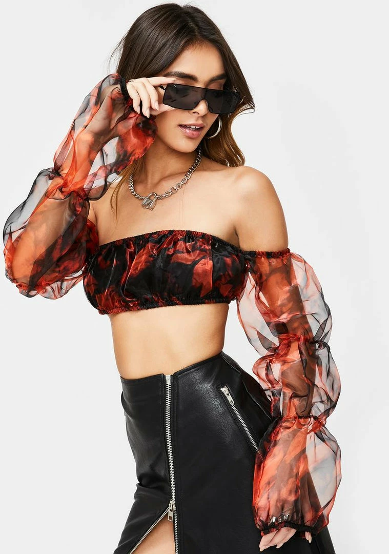 cuz youΓ’ΒΒre the girl of their dreamz! Stay flirty in this off the shoulder crop top that has sheer puff sleeves, elasticated hems NΓ’ΒΒ a tie dye print all ova.