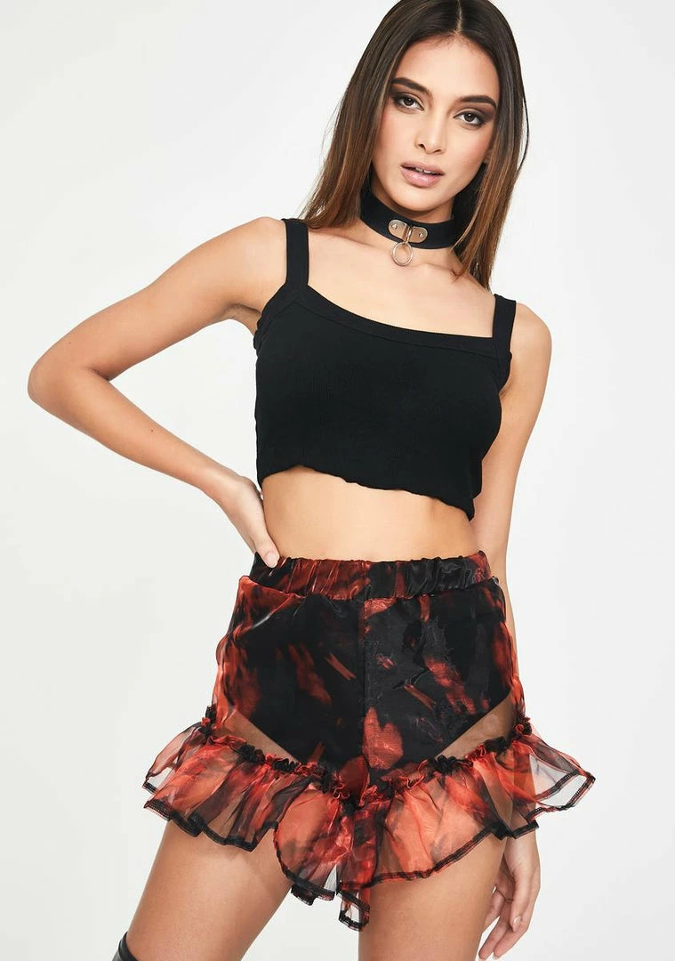 give Γ’ΒΒem Mia vibez. YouΓ’ΒΒre a dope doll in these sheer organza shorts that have an elastic waistband, ruffled hems, and a tie dye print all ova.