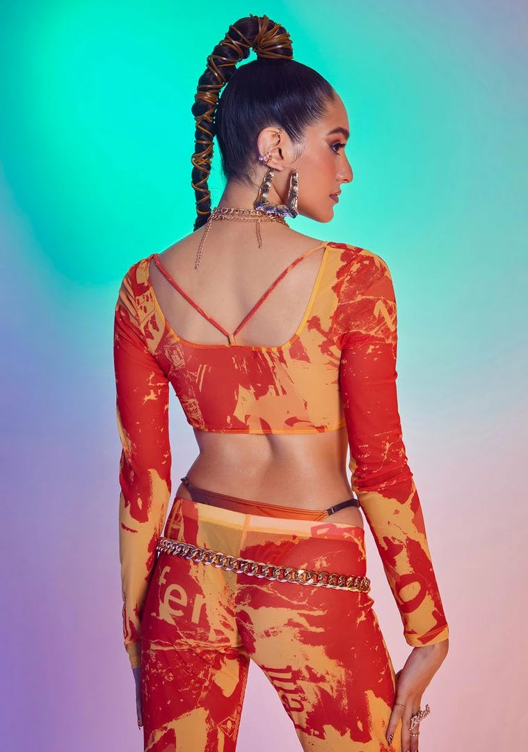 cuz youΓ’ΒΒre always in the headlines! This long sleeve mesh crop top has a cutout design with lace-up details and a tonal print all over.