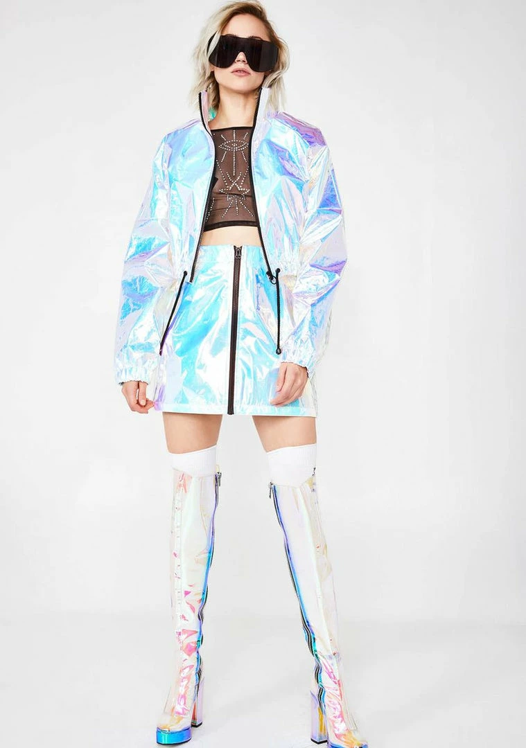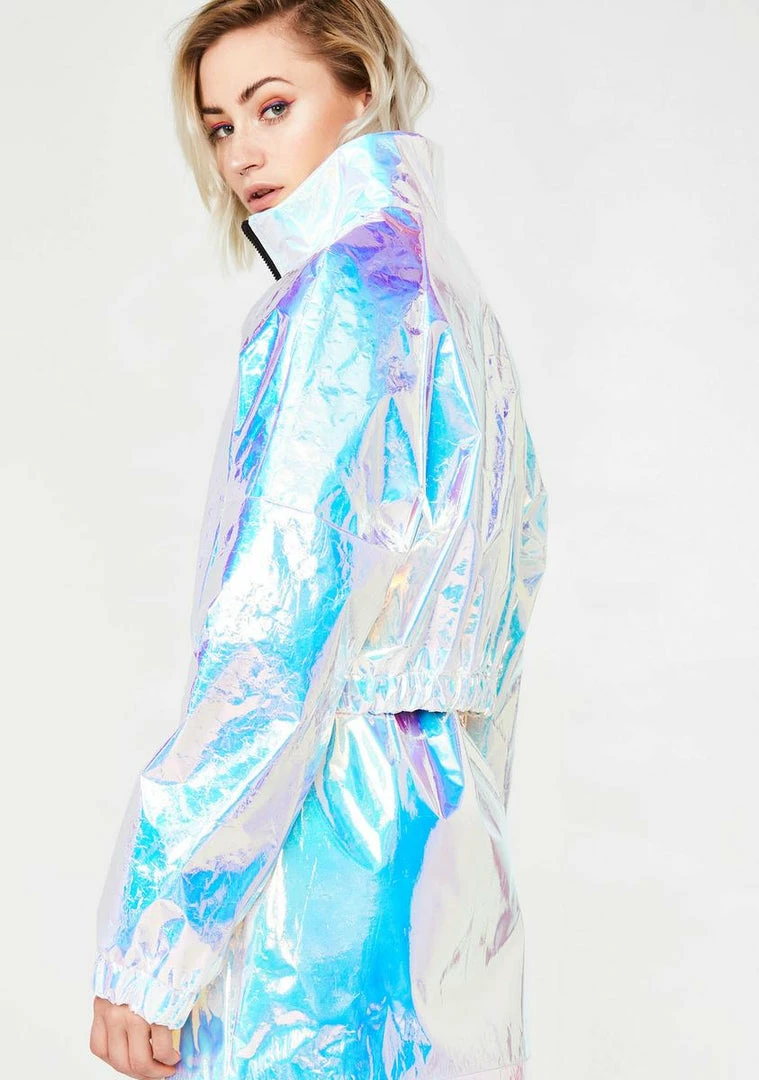 will awaken âem with ya freaky flash. Youâre glam ecstasy in this stellar holographic jacket that has a high neckline, a drawstring waistband, and a front zip closure.