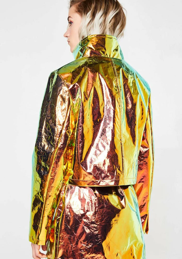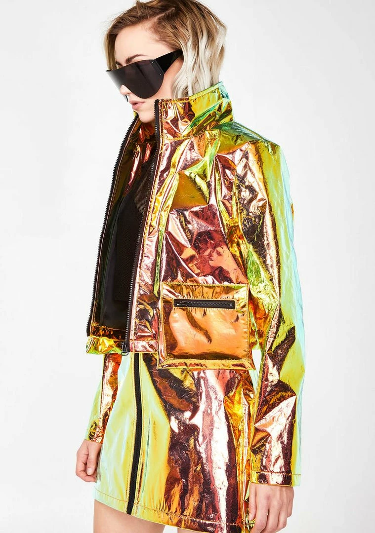 will awaken Γ’ΒΒem with ya freaky flash. YouΓ’ΒΒre glam ecstasy in this stellar golden holographic jacket that has a high neckline, a front zip closure, and pockets on the sides.