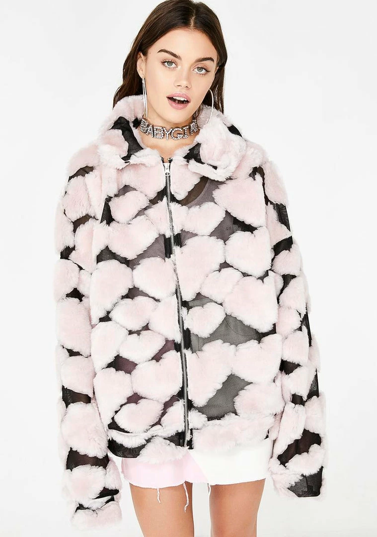 cuz youΓ’ΒΒre a lover bb. Snuggle up in good vibes with this cozy AF jacket that has furry hearts all ova, mesh lining, and a front zip closure.