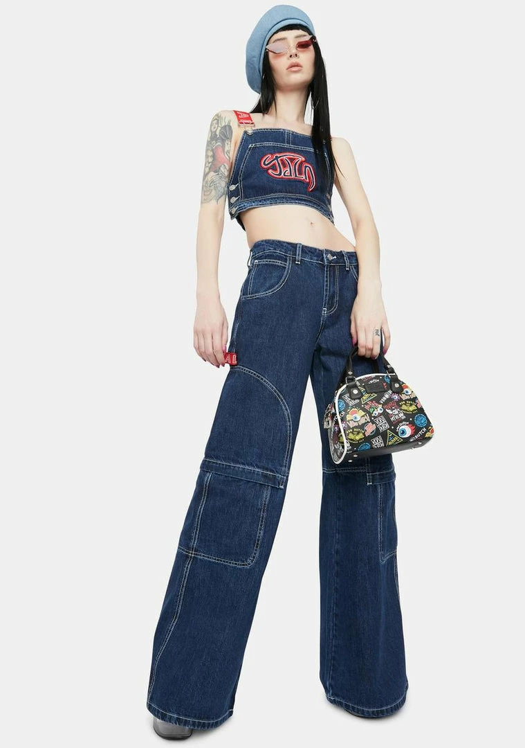 give รขยยem throwback vibes! These oversized wide leg denim jeans have contrast stitching all over, a low rise fit, pockets on the front and back, and a red logo strap.