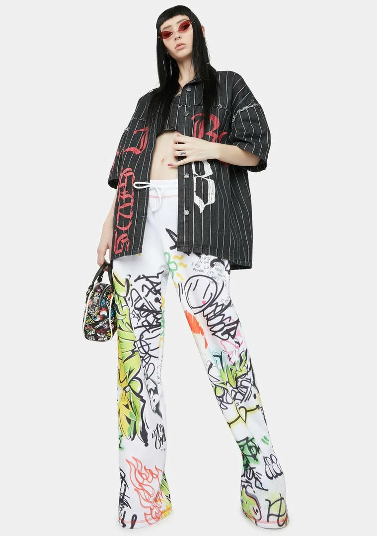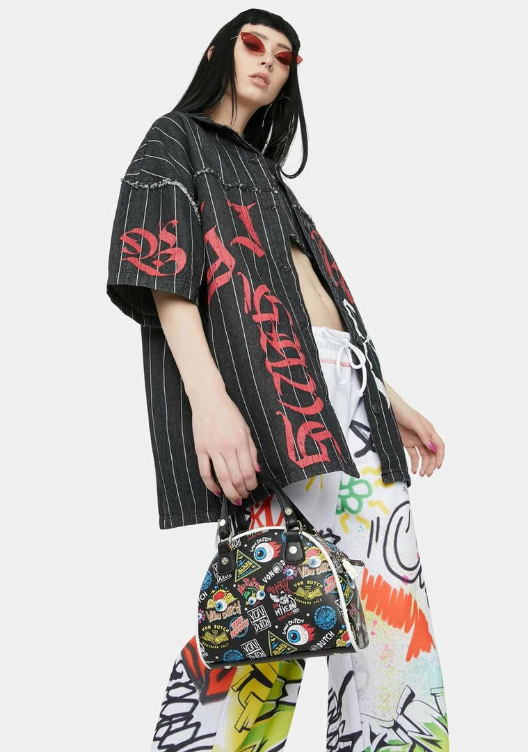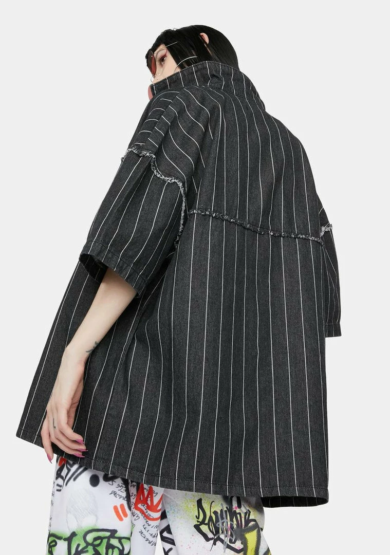 cuz you play for the winning team! This pinstripe denim shirt has button up closures, sporty graphics and an oversized fit.
