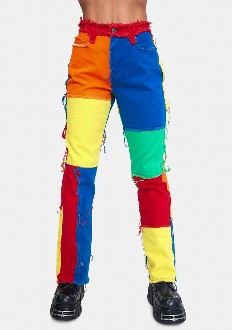 cuz youΓ’ΒΒre the brightest of the bunch! These rainbow denim jeans have a patchwork construction, raw edge details, a high waist fit and pockets on the back.
