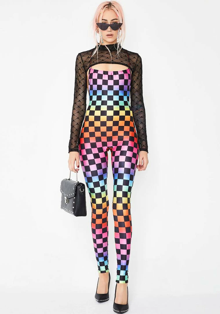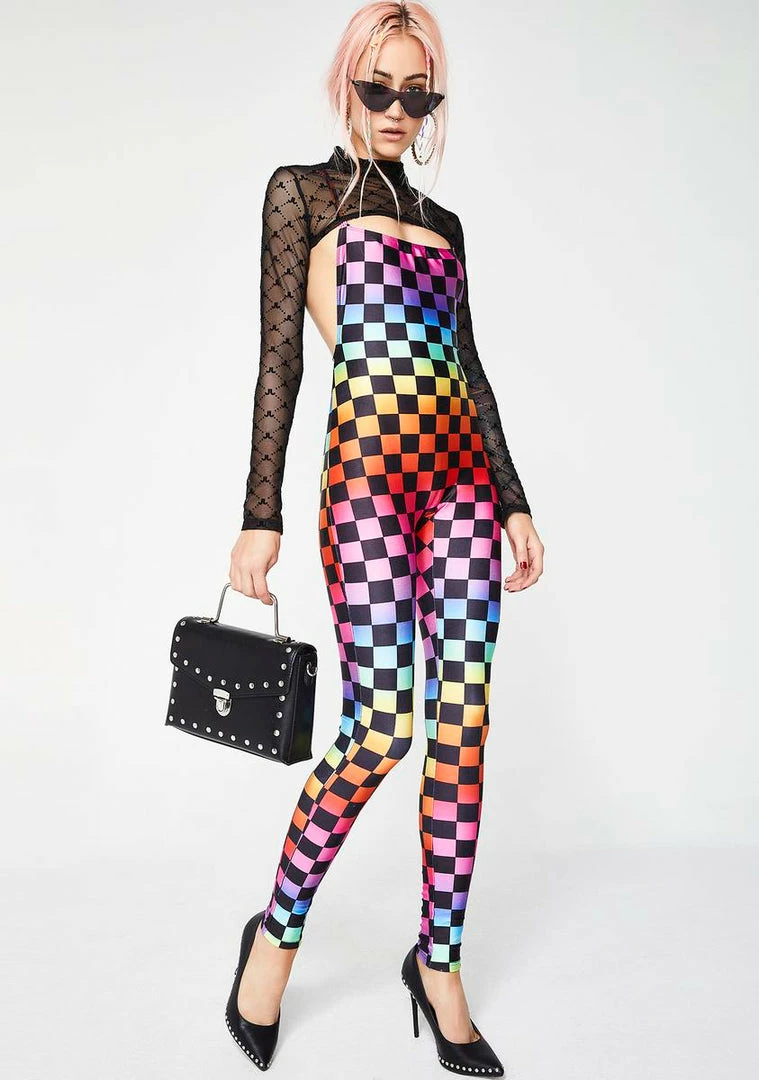 cuz youΓ’ΒΒre doing big thangs, bb. Follow the rainbow in this catsuit that has a rainbow checkered print all ova, a sheer logo mesh shrug and crossover straps on the back.
