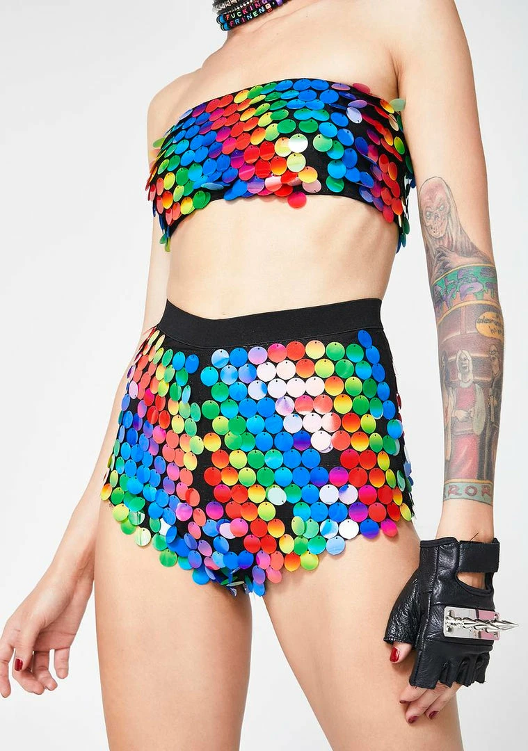 cuz everyone wants to get lit with you. Follow where the rainbow goes with these high-rise hot pants that have a cool rainbow disc sequin detail all ova and a zip closure.