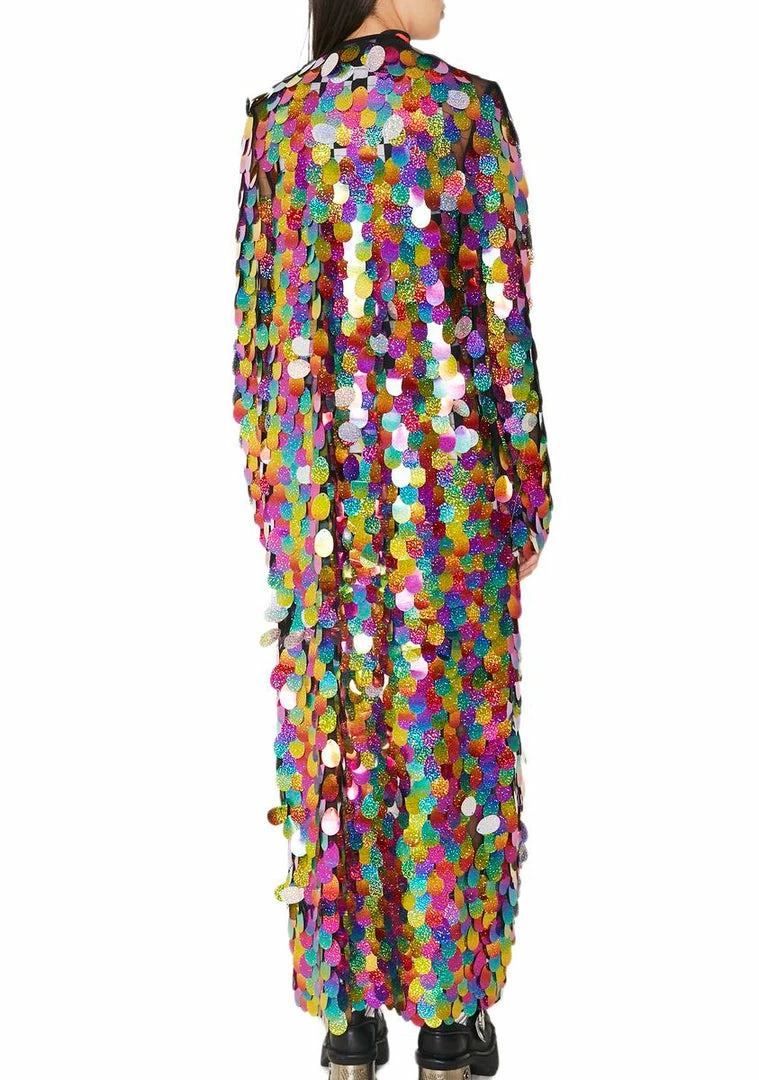 ya gotta leave yer expectations at the door, babe…Strut with some serious glam rock vibez in this crazy amazing kimono featuring a floor-length black mesh construction, allover giant holographic rainbow sequins and bell sleeves.