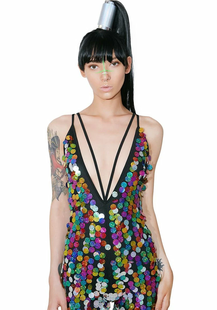 they got nothinΓ’ΒΒ on yer epic level of sparkle, bb…Embrace yer extra-ness with this sikk af catsuit featuring a stretchy black construction, allover holographic rainbow sequins, plunging neckline with strap detail, open back and adjustable straps.