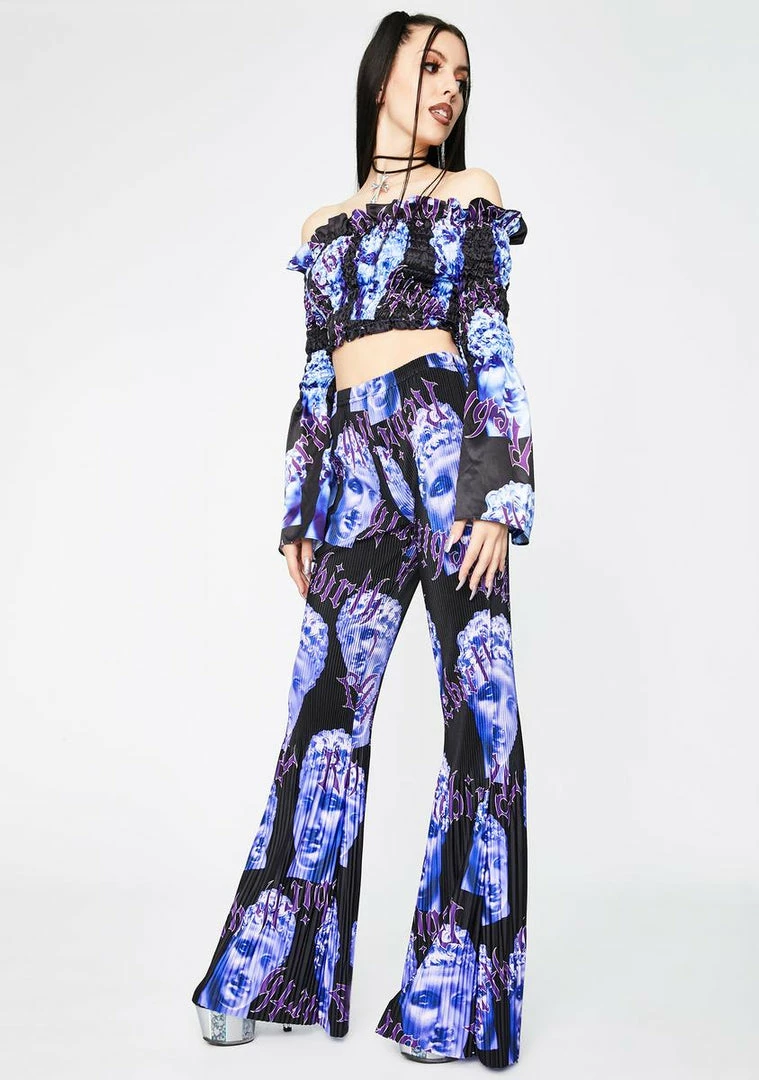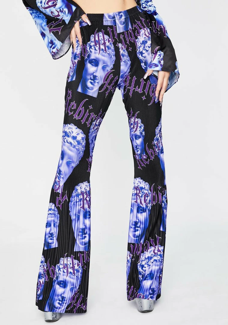cuz youΓ’ΒΒre timeless, babe. Stay on their minds in these shirred plisse boot cut trousers that have a high waist fit and a rebirth statue print all ova.