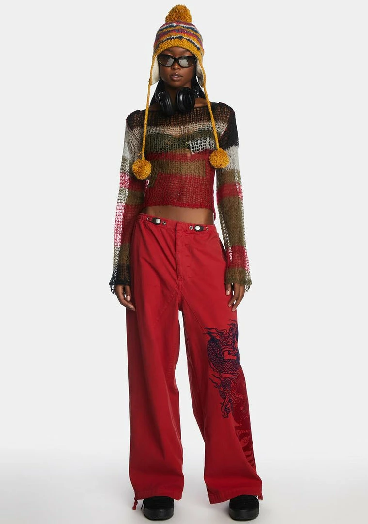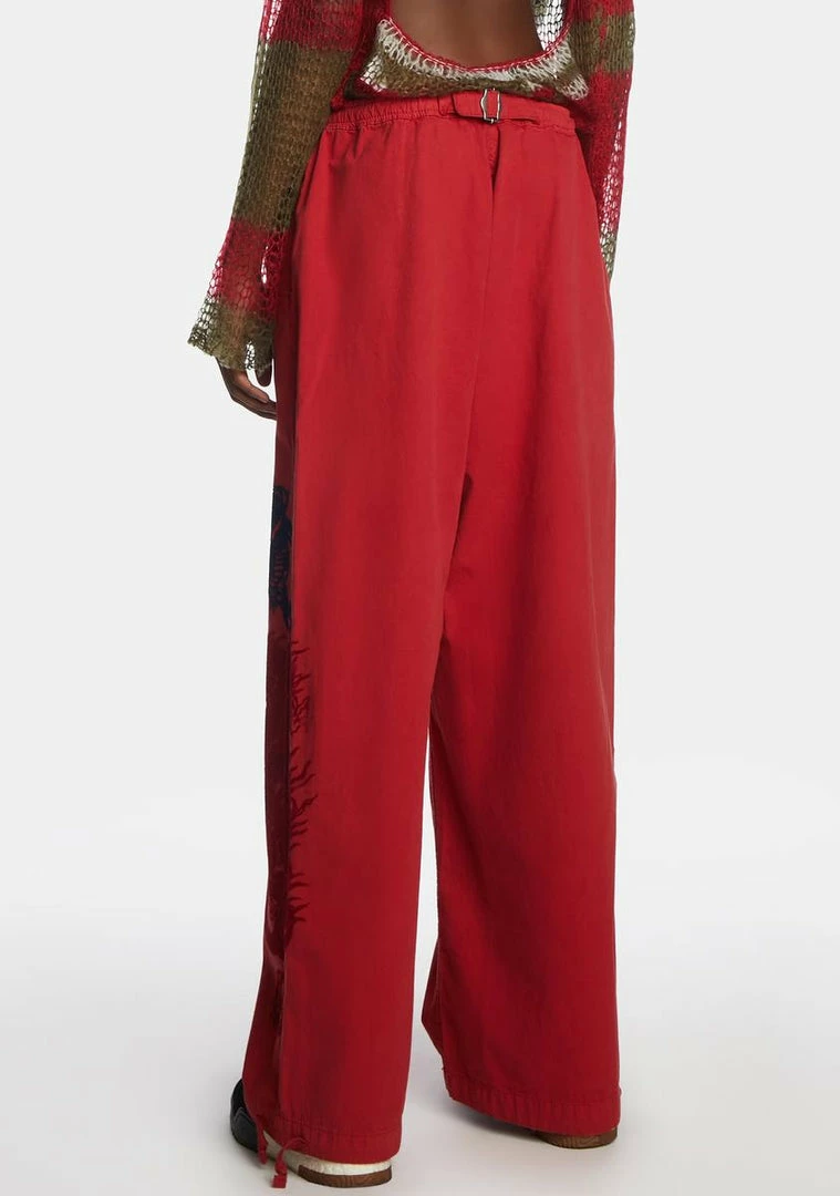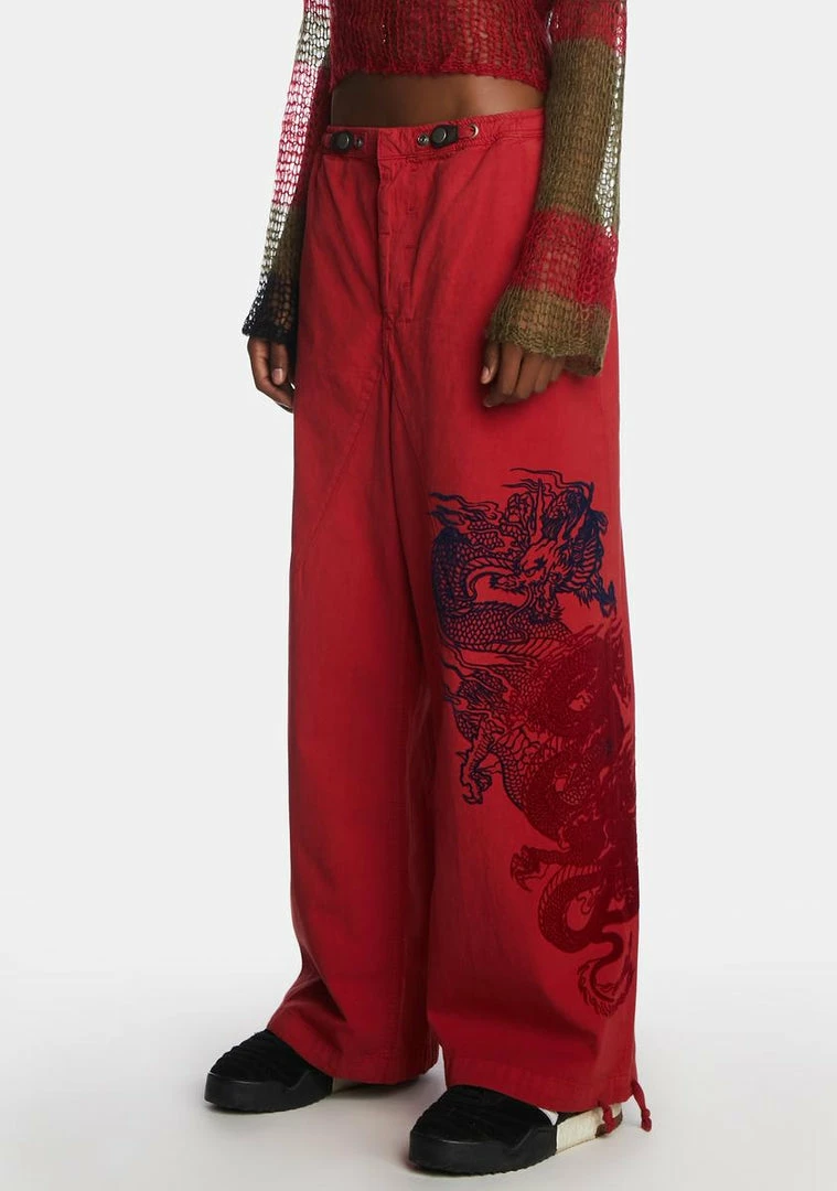 cuz you’re a dangerous diva. These oversized cargo pants have dragon flocked graphics on the front, an adjustable waistband, a zip-fly closure, and adjustable drawstring cuffs.