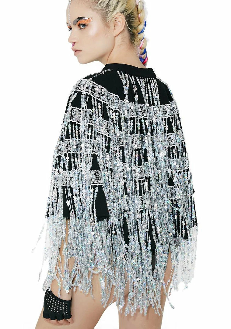 ur the hero in all my intergalactic daydreamz babe. Stomp outta ur space whip in this dope sparkly fringed cape with a silver buckle closure on the front.