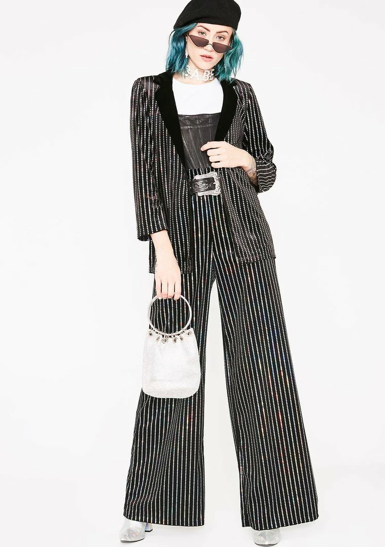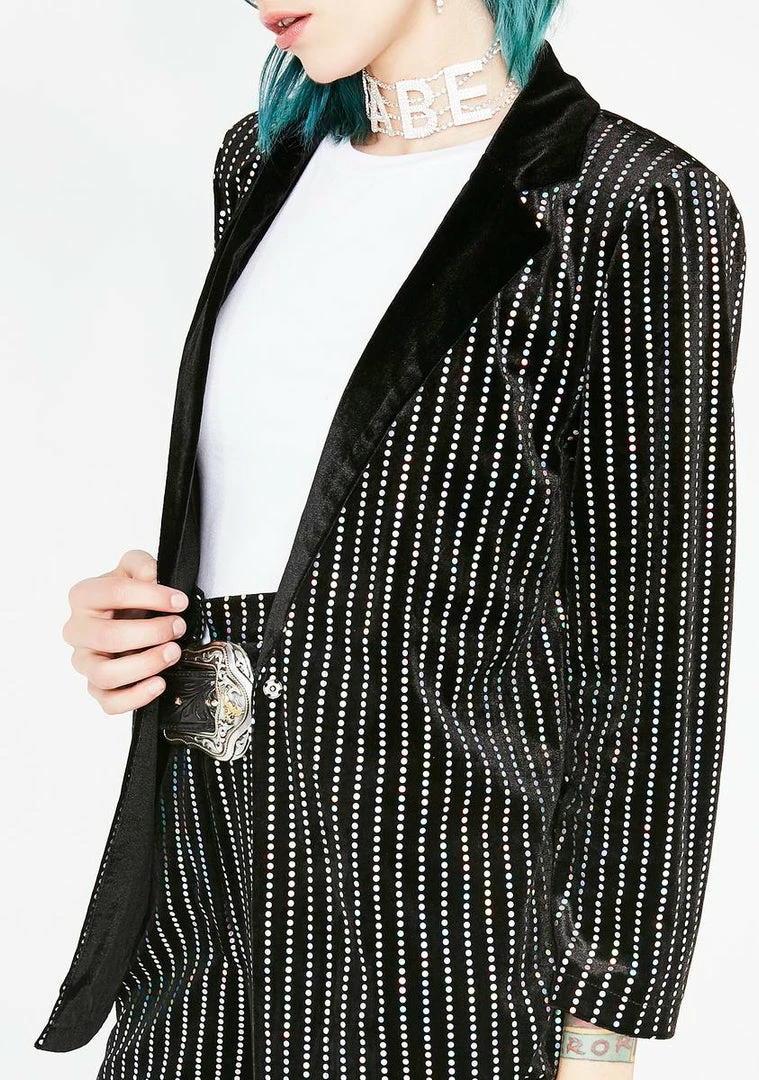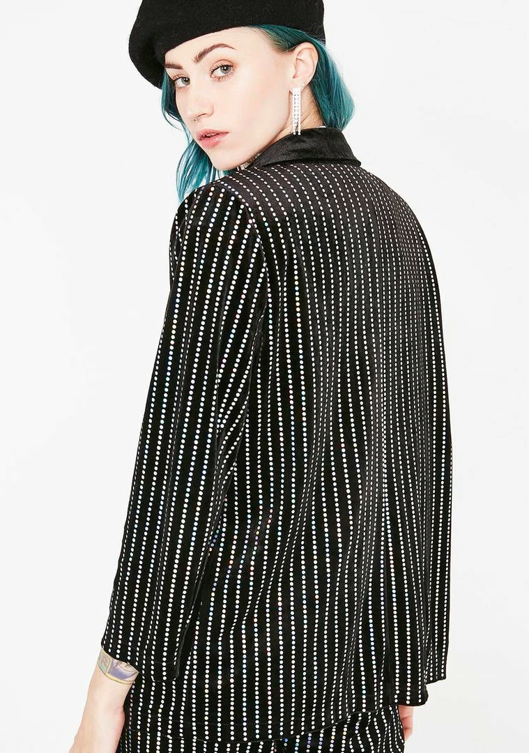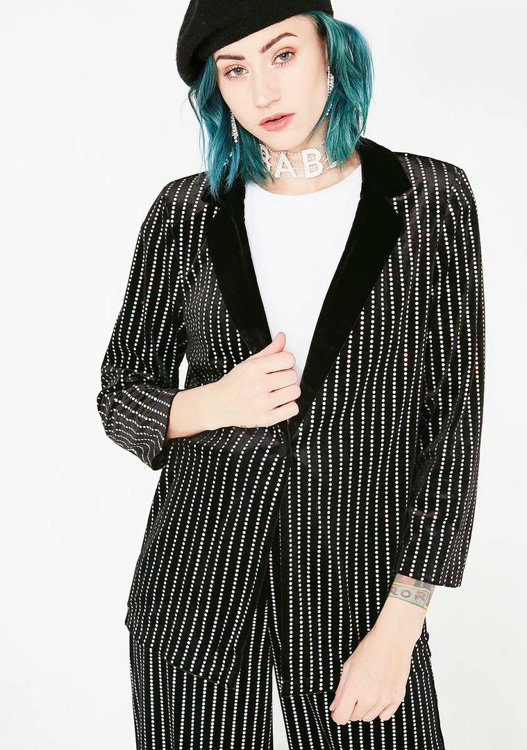 cuz they know you as the most high glamorous! Turn heads at the party with this velvet blazer that has holographic sequin stripes all ova, notched lapels, padded shoulders, and a single button closure.