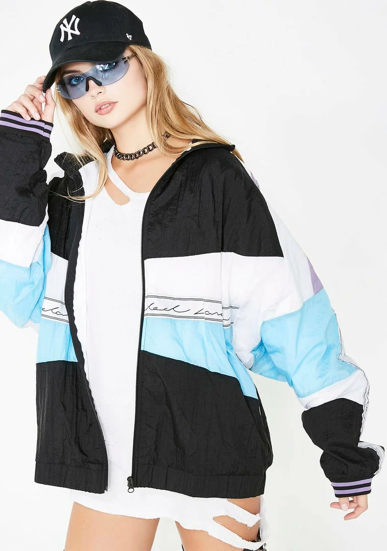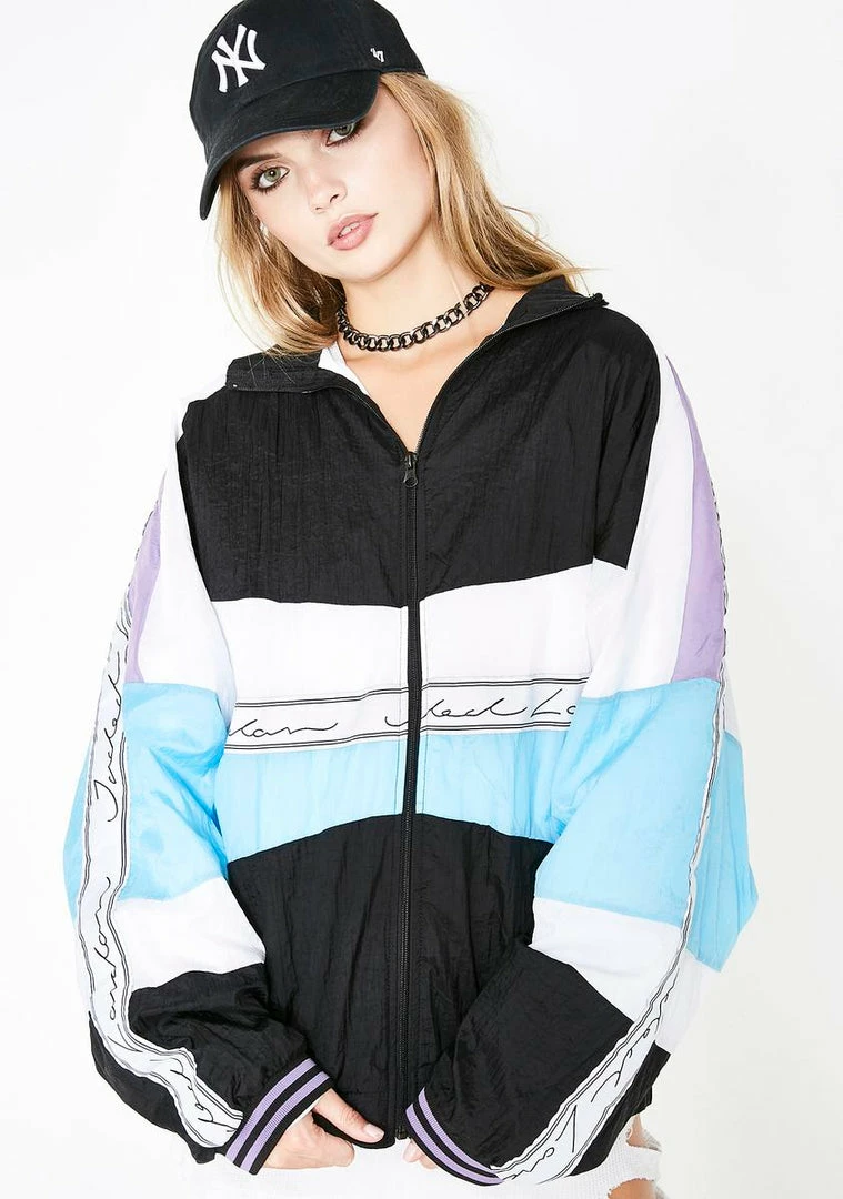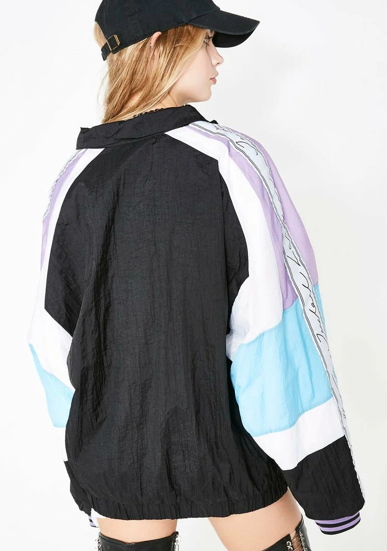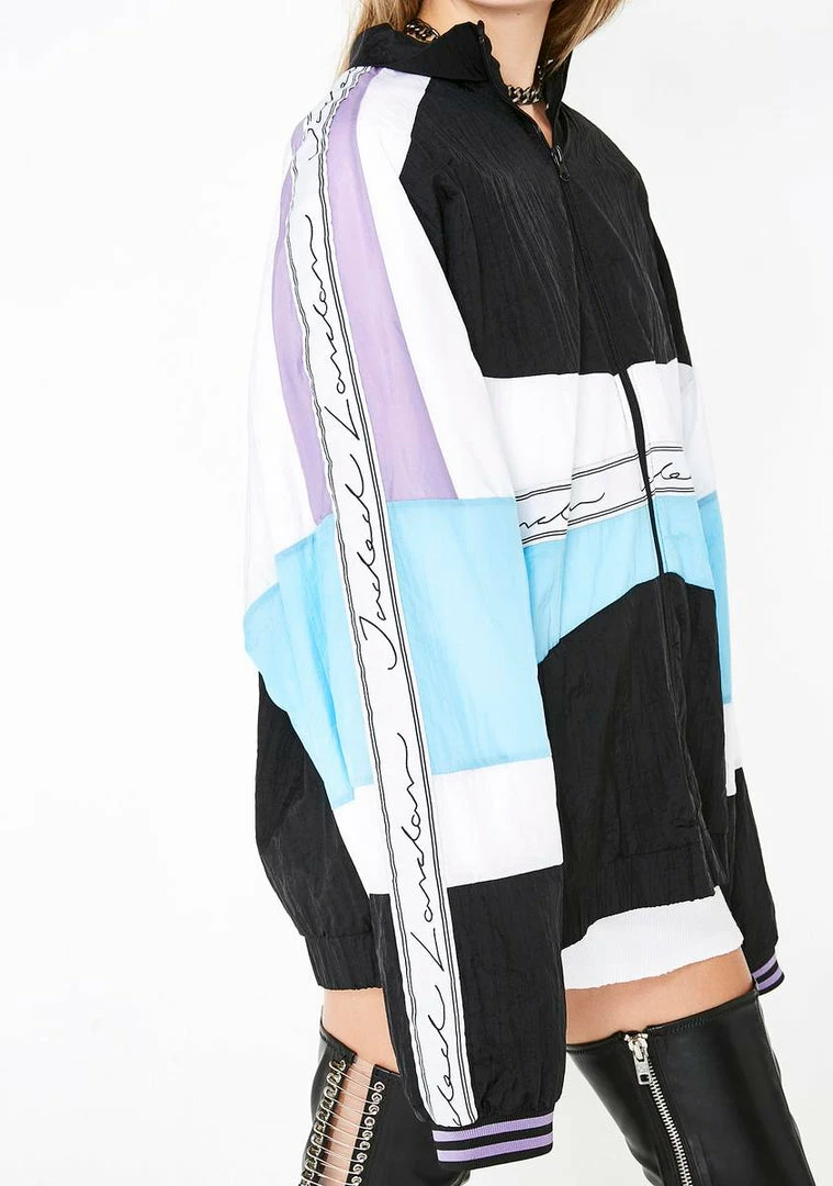 will have ya stayinΓ’ΒΒ ahead of the competition! AinΓ’ΒΒt no match in this dope track jacket that has color blocking all ova, a front zip closure, and cursive logo tape along the sleeves.