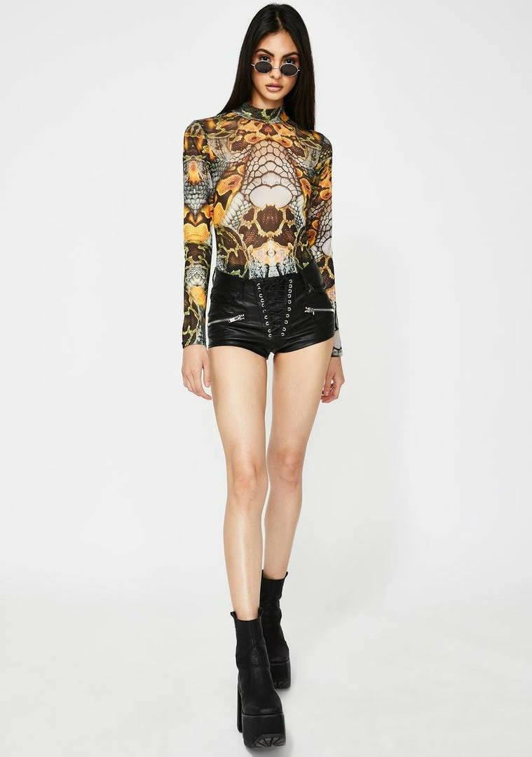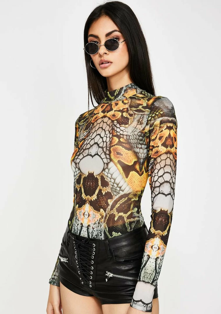 got ya feelin’ so deadly N’ divine. Be the venom in their veinz with this snakeskin mesh bodysuit that has long sleeves, a mock neckline, a thong back N’ a bikini snap closure.