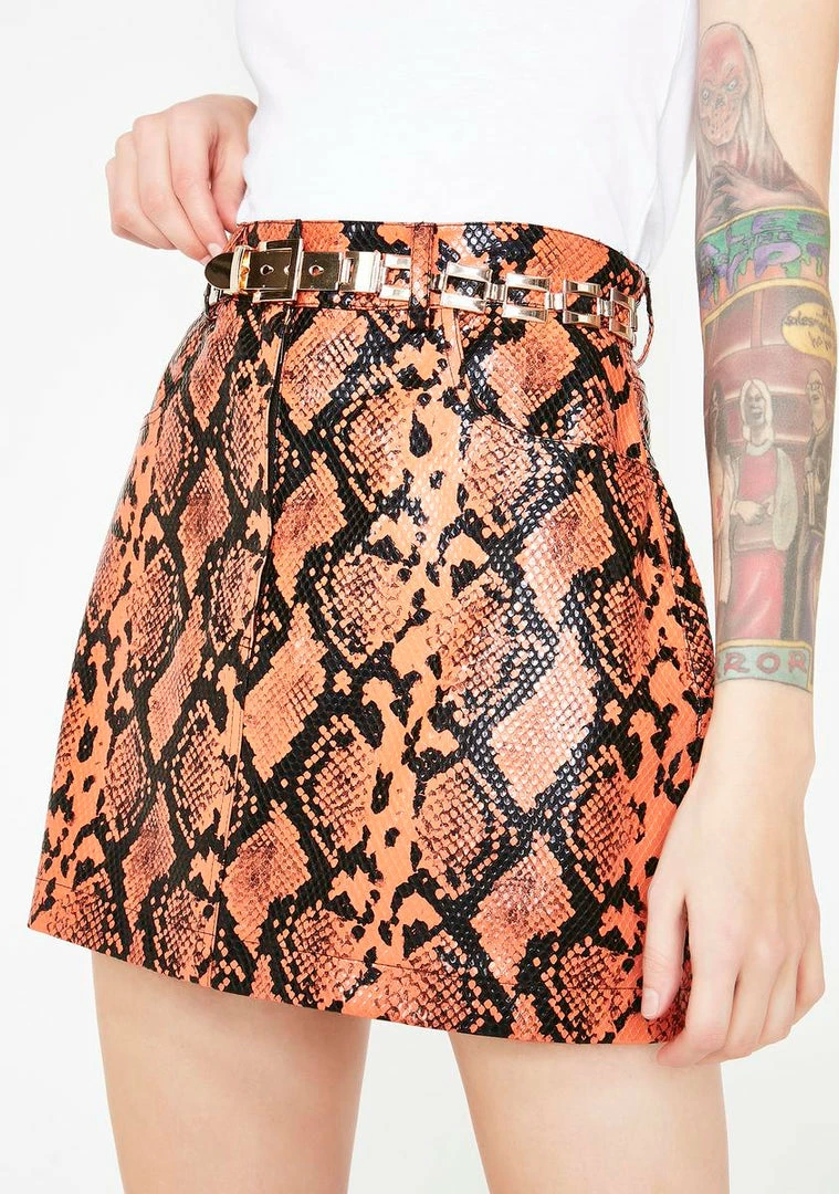 cuz if looks could kill, youΓ’ΒΒre the deadliest of them all babe! Give Γ’ΒΒem a warning in this vinyl snake print mini skirt that has a high-waist fit, a zip fly NΓ’ΒΒ button closure, and a gold chain belt.