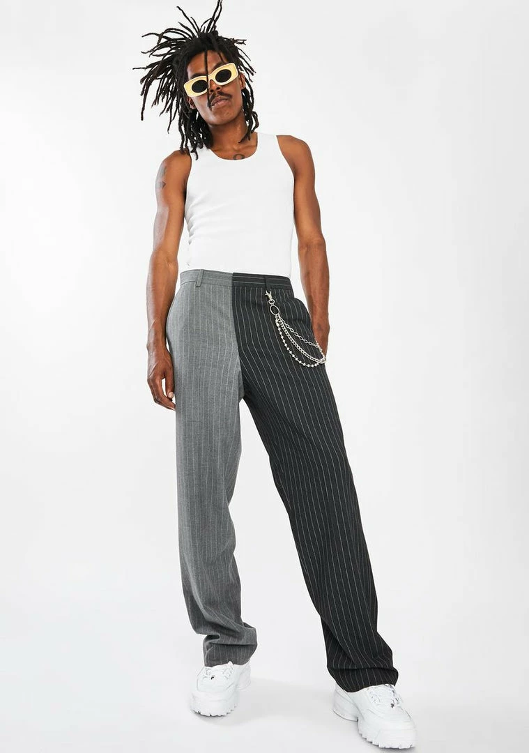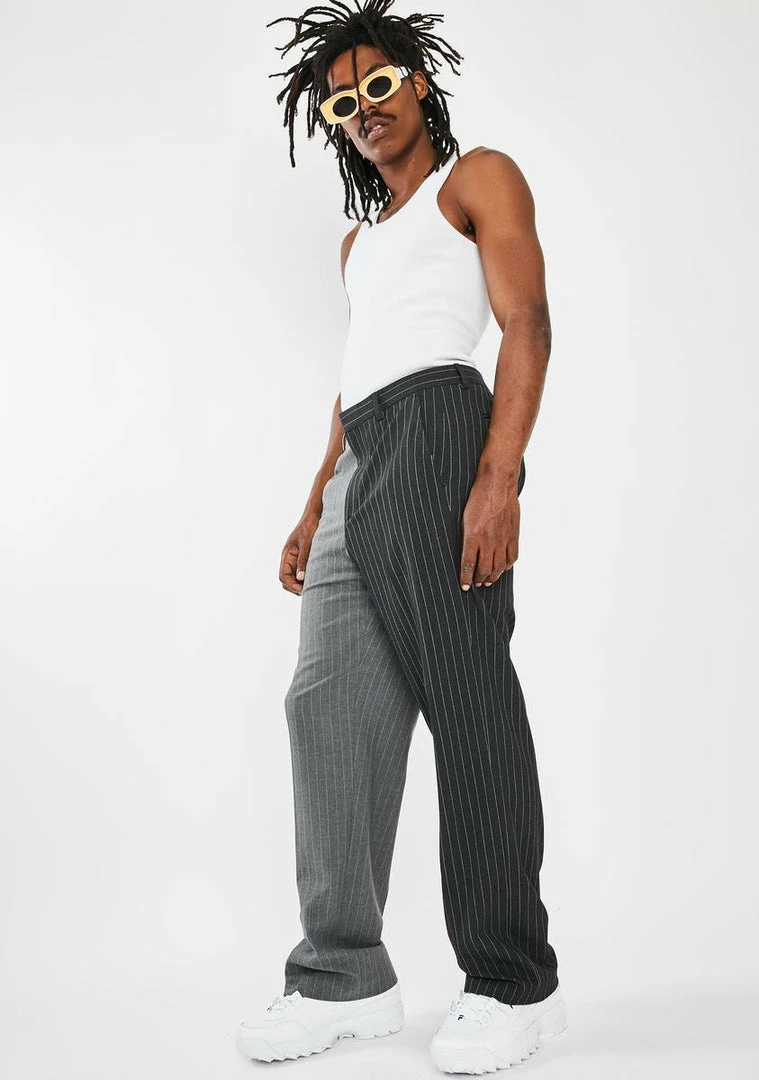 cuz they don’t match your mood, babe. Keep ’em guessing in these two-tone split pants that have a relaxed leg fit, pockets on the sides N’ a pinstripe pattern all ova.