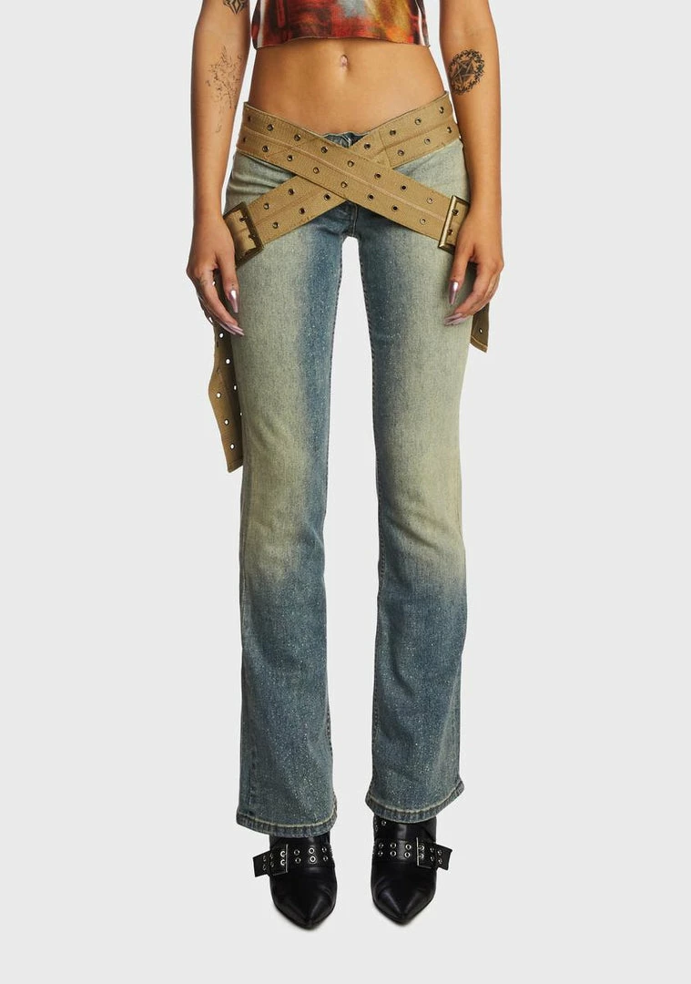 got ’em swipin’ right! These low-rise jeans have a stonewash denim construction, an attached webbing belt, and a V-front waistline.
