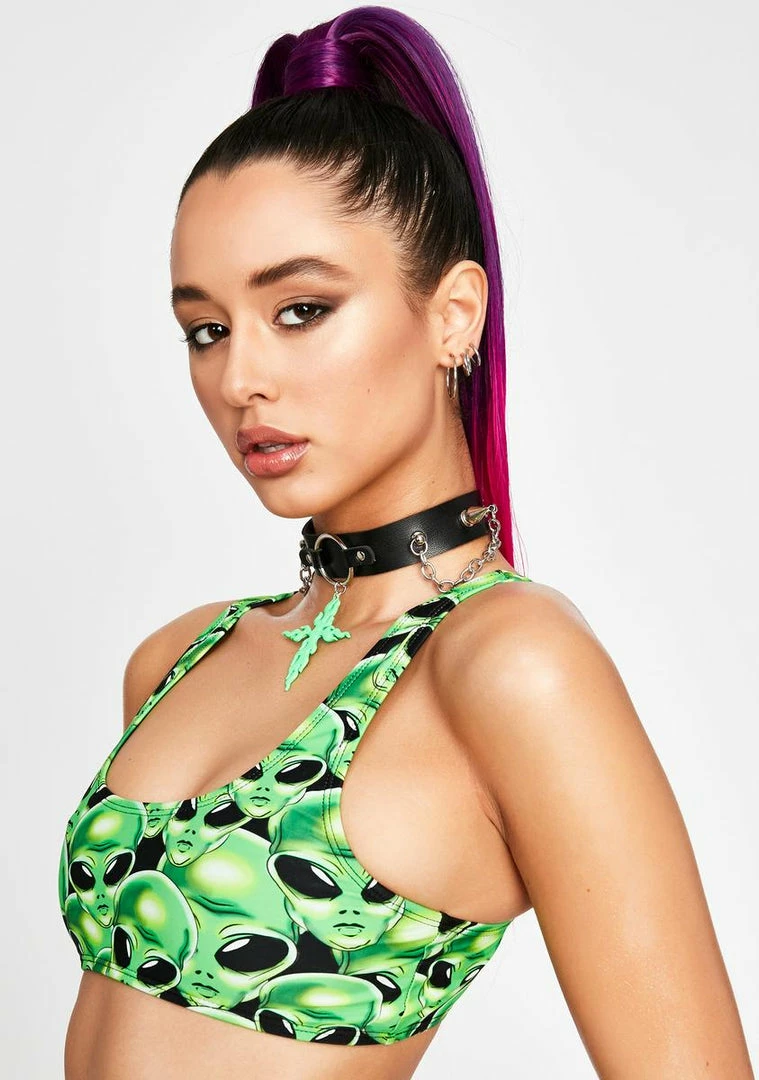cuz youΓ’ΒΒre not from this planet, babe! Get outta this world in this bikini top with a cropped fit and an alien print all ova.