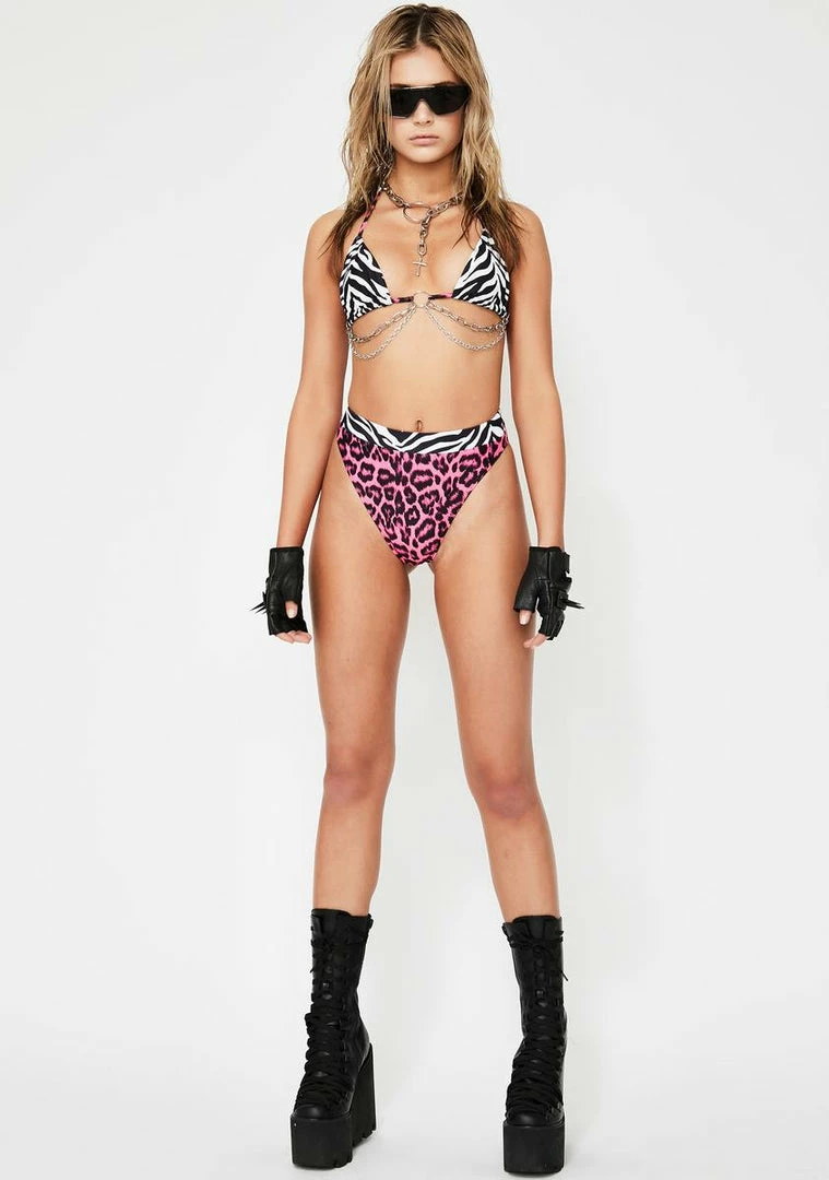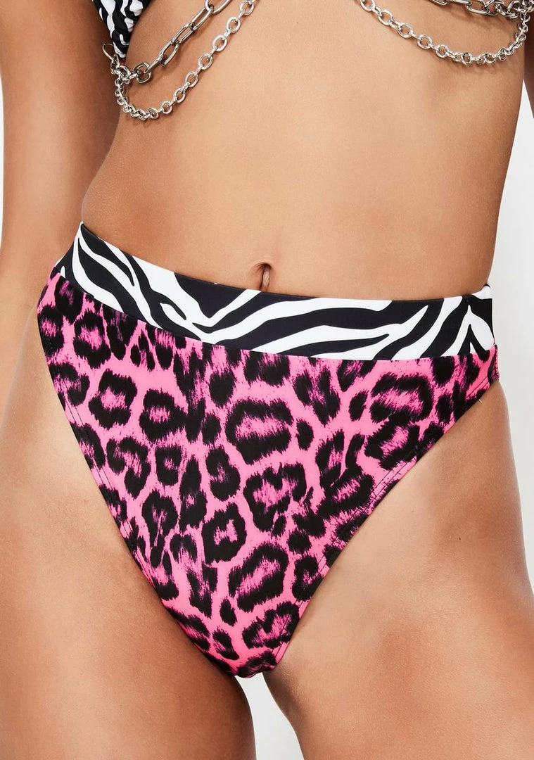 got ya runninΓ’ΒΒ wild bb! Look hawt AF in these high-waisted leopard bikini bottoms that have a zebra trim NΓ’ΒΒ a cheeky fit.