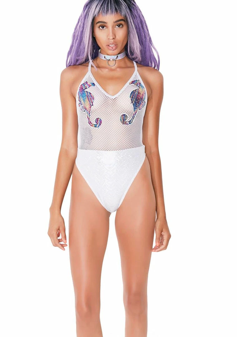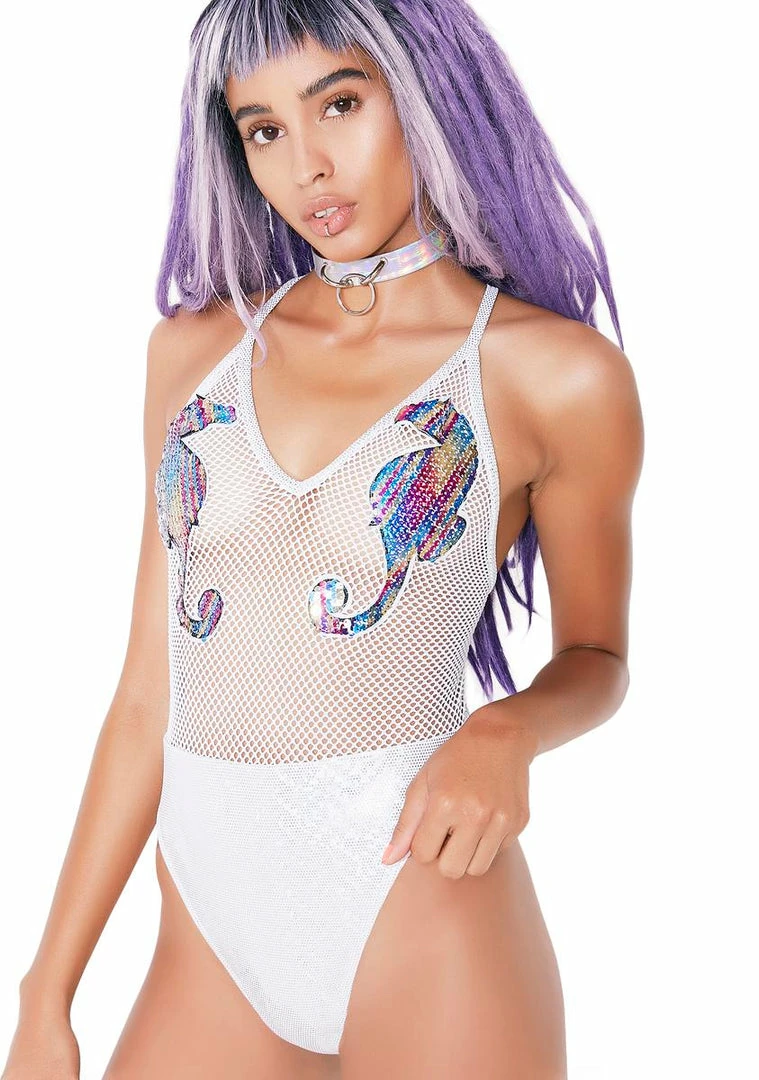 got ya lookinΓ’ΒΒ like da finest sea maiden evr, bb! This supa cute swimsuit features a silvery white mesh construction on top with a solid silvery patterned bottom, v neckline, criss-crossinΓ’ΒΒ back, and two sparkly sequin seahorses coverinΓ’ΒΒ yer girlz.