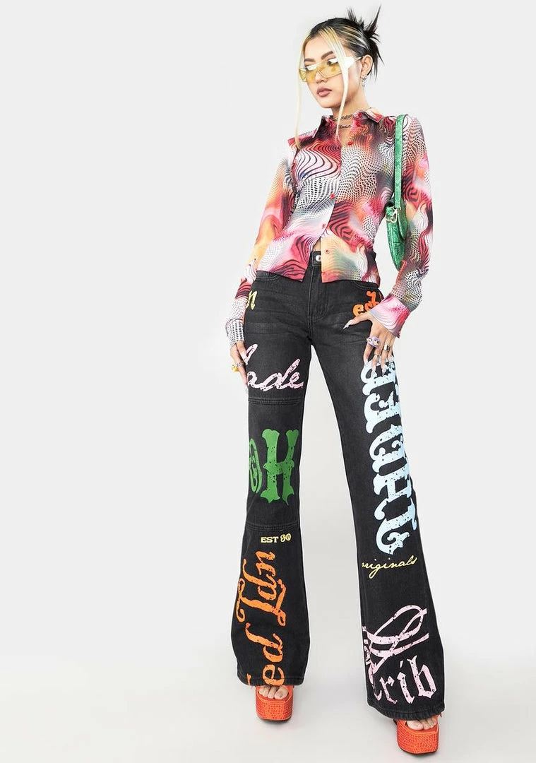 give รขยยem psychedelic sass. This button up shirt has a lightweight jersey material, a collared neckline, and a colorful swirl print all over.