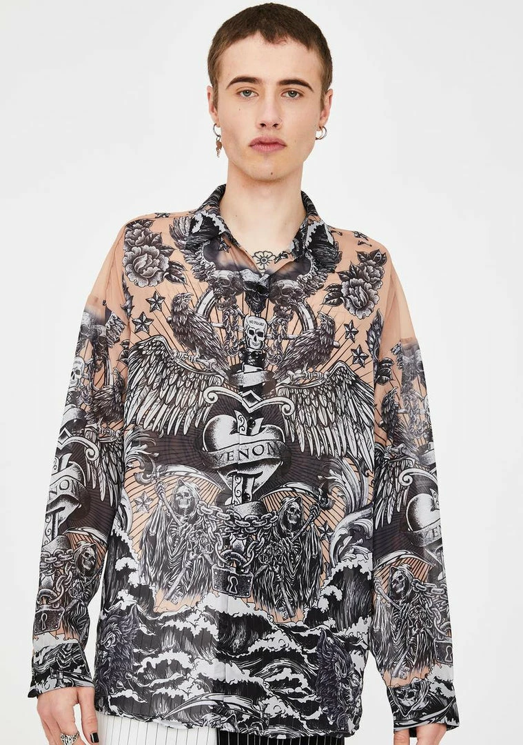 cuz youΓ’ΒΒre a lethal lover. Look dope AF in this lightweight long sleeve shirt that has button up closures, a relaxed fit NΓ’ΒΒ a vintage tattoo print all over.
