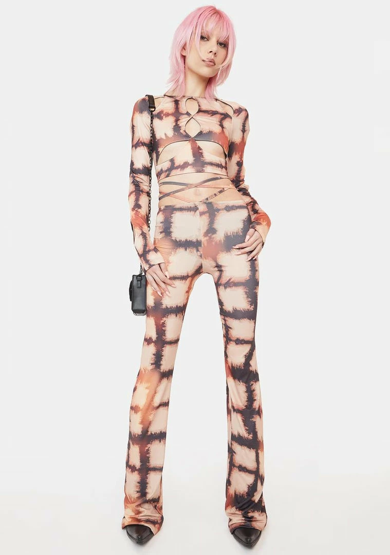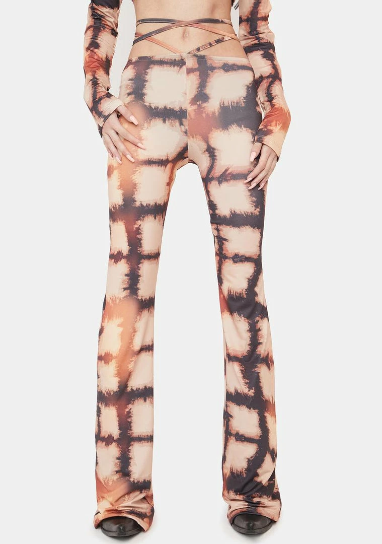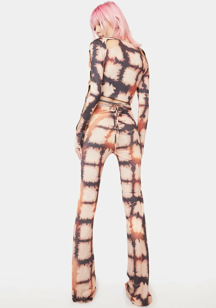 cuz you’re checking out the competition. These stretchy bootcut trousers have strappy tie waist details, a ruched seam on the back, and a warped check tie dye pattern all over.