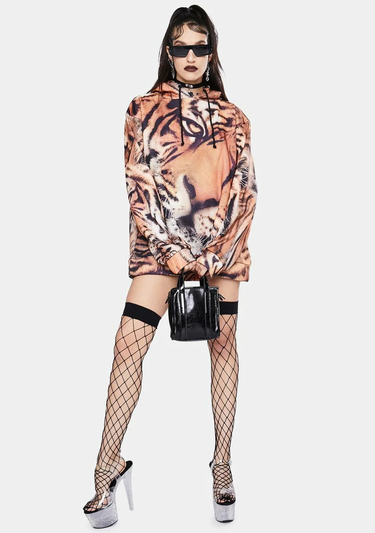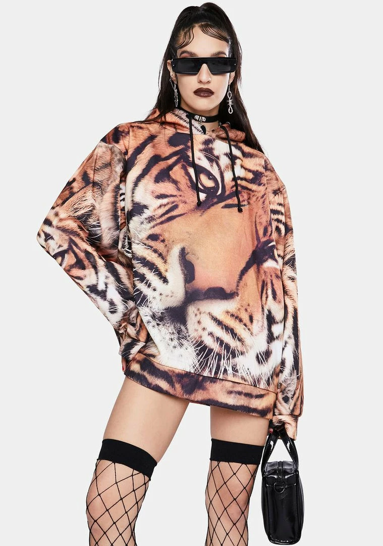 cuz youΓ’ΒΒre gonna hunt them down. This pullover hoodie has adjustable drawstrings, an oversized fit, and a tiger print all over.