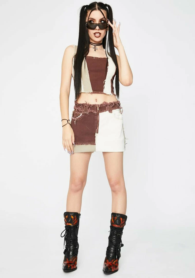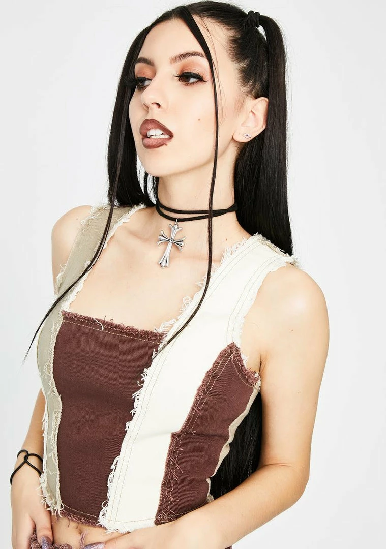 cuz ya always keep thingz interesting! They wait for ya next move in this patchwork denim corset crop top that has a square neckline, frayed seams Nรขยย a back zip closure.