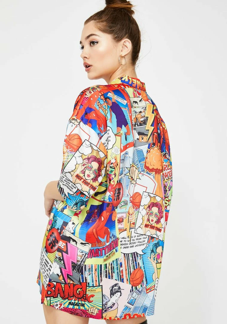 cuz youΓ’ΒΒre a pop art princess! Wham, bam, thank you maΓ’ΒΒam in this button up shirt that has a revere collar, an oversized fit, and comic graphics all ova.