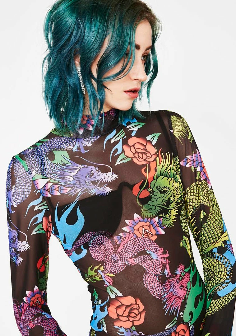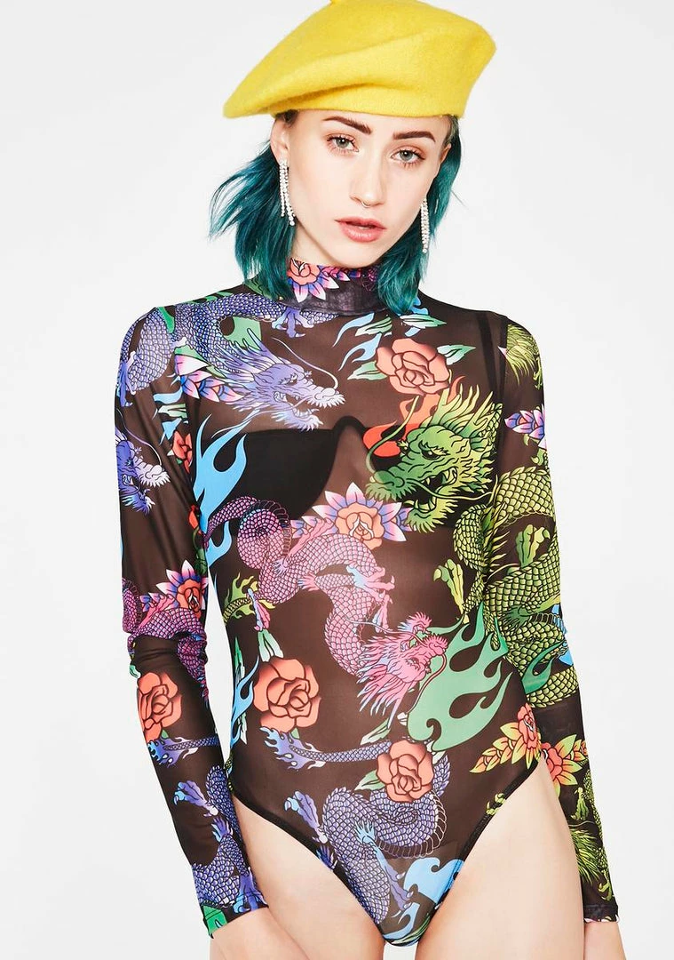 cuz youΓ’ΒΒre on full slay mode sis! They canΓ’ΒΒt mess with ya in this mesh bodysuit that has a dragon print all ova, a mock neckline, and a thong back.