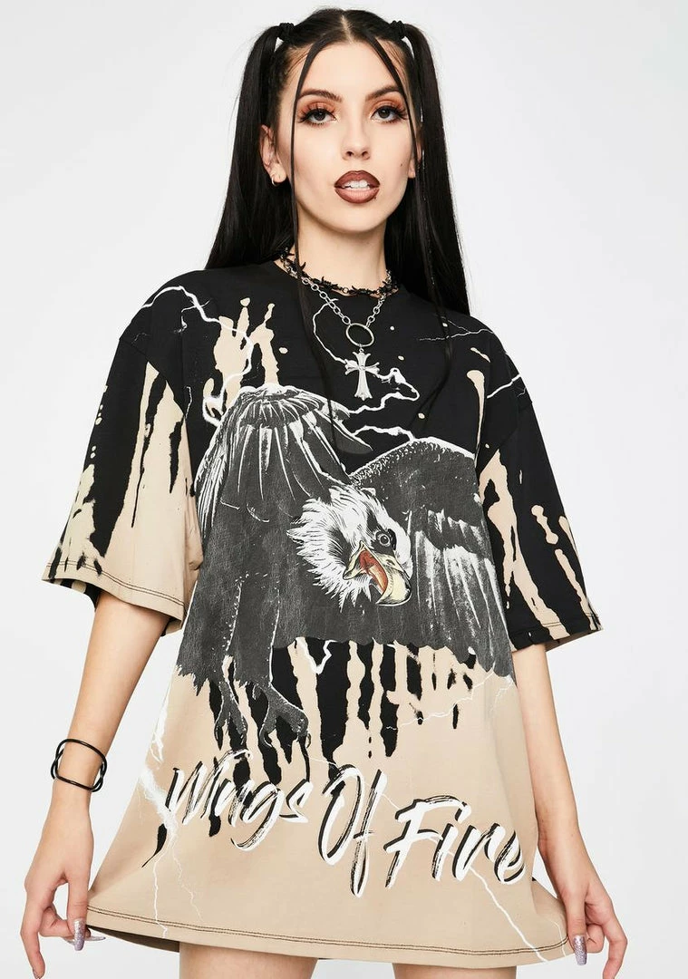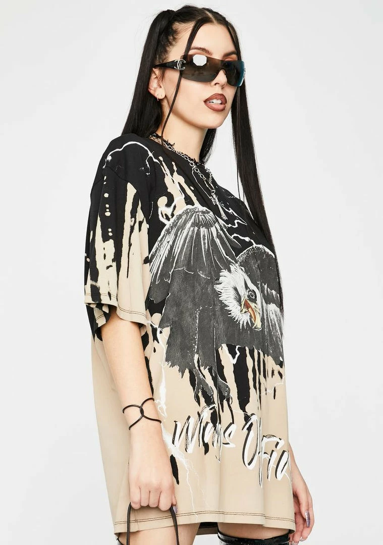 got ’em in a world of chaos. Look sikk AF in this oversized t-shirt that has short sleeves, a dope splatter print N’ eagle graphics on the front.
