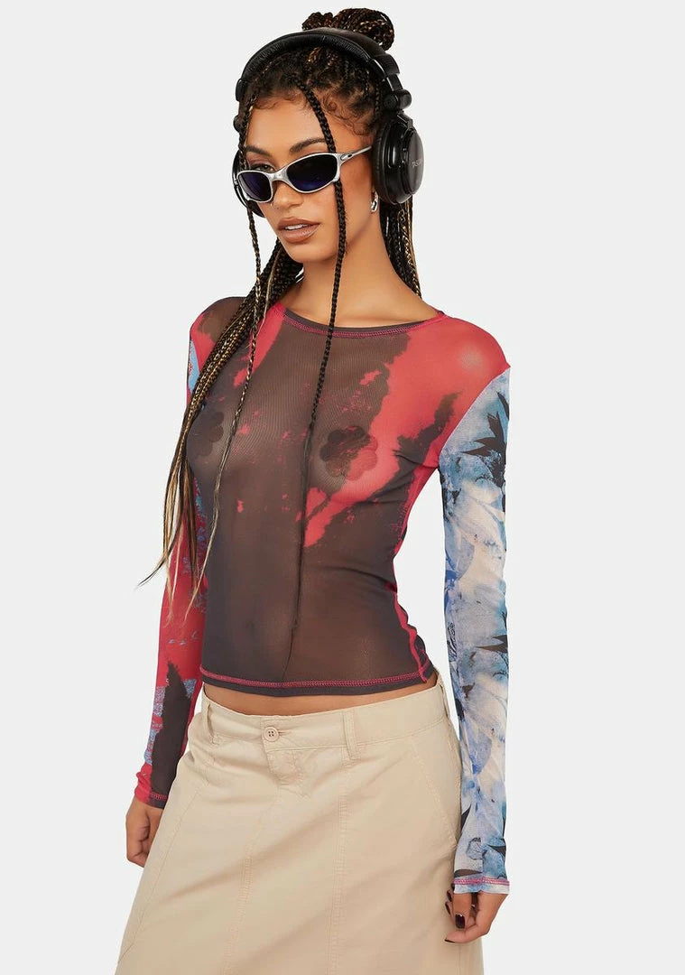 cuz they can’t help but be jealous. This long sleeve top has a ripped illusion print all over, a stretchy semi-sheer mesh construction, and a crew neckline.