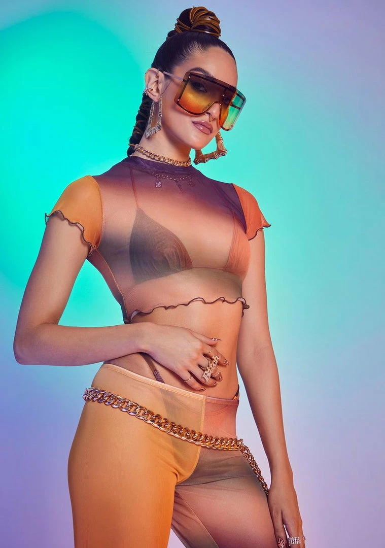 cuz youΓ’ΒΒre always on point. This stretchy mesh crop top has an ombre pattern, short sleeves, a high neckline, and lettuce edge trim.