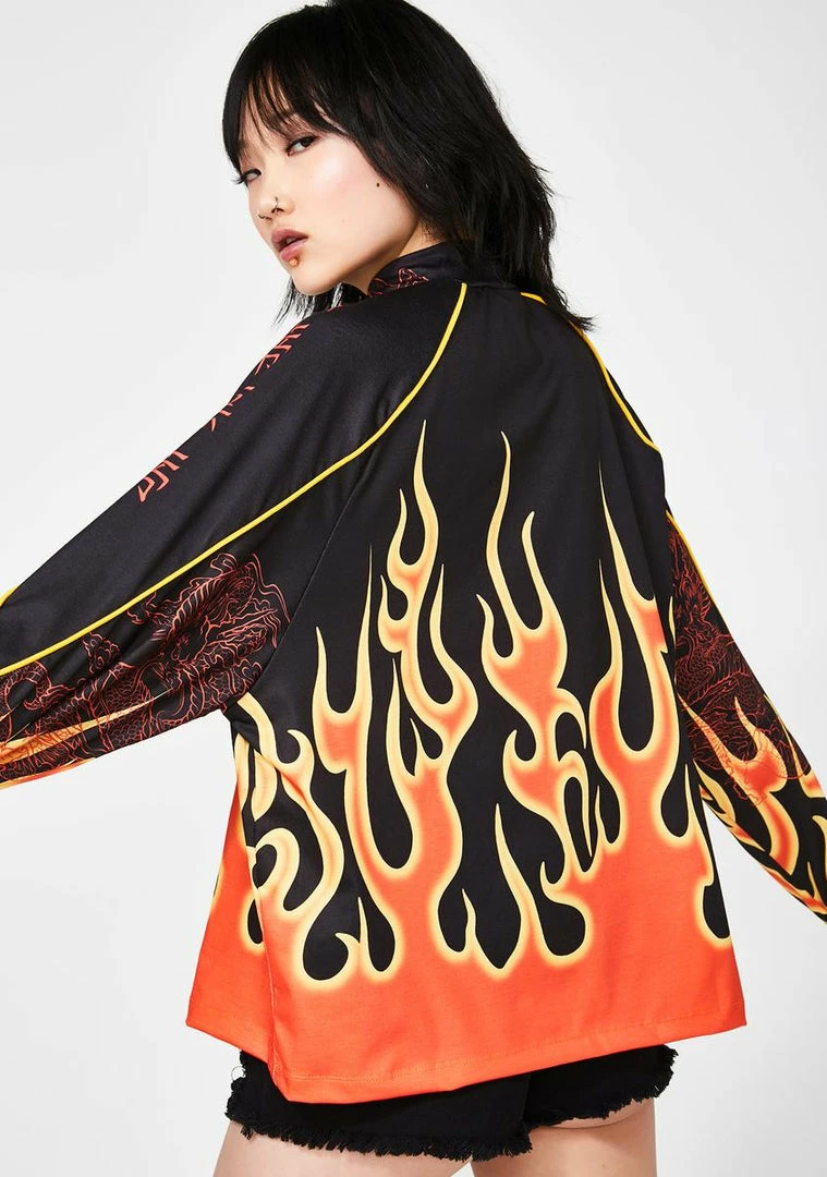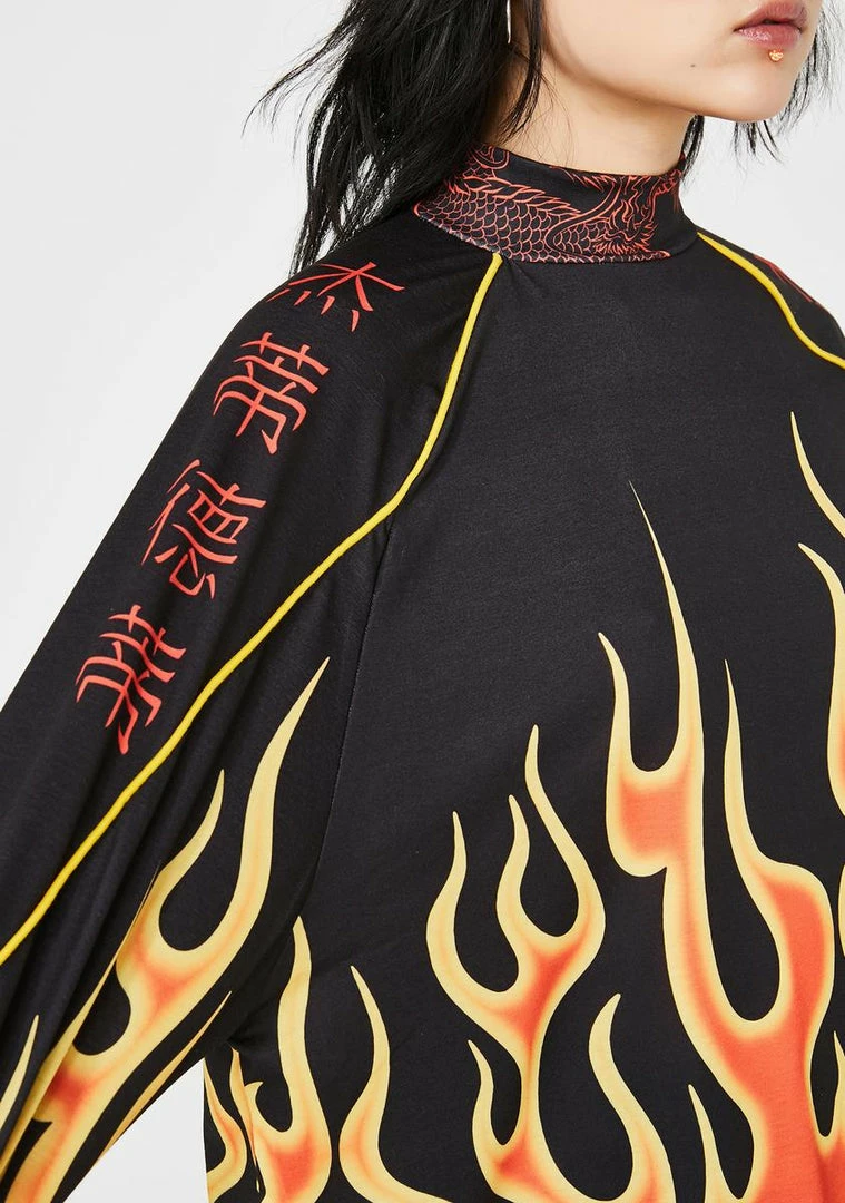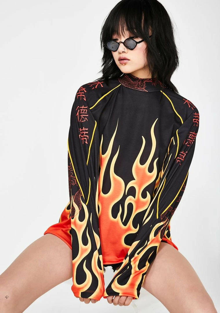 cuz you always bring the heat! ItΓ’ΒΒs always fire season in this supa hott raglan tee that has a high neckline, long sleeves, and a flame print all ova.