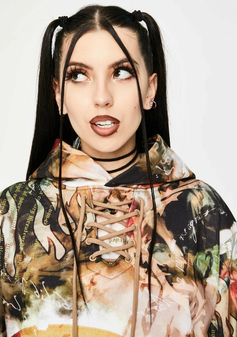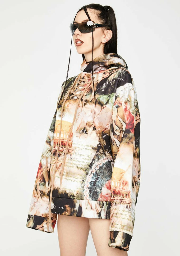 cuz youΓ’ΒΒre a work of art, babe! YouΓ’ΒΒll always be their treasure in this comfy oversized hoodie with lace-up details on the front and a renaissance script print all ova.