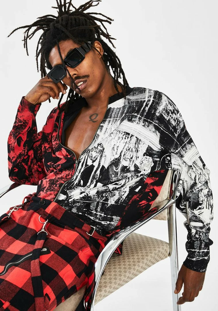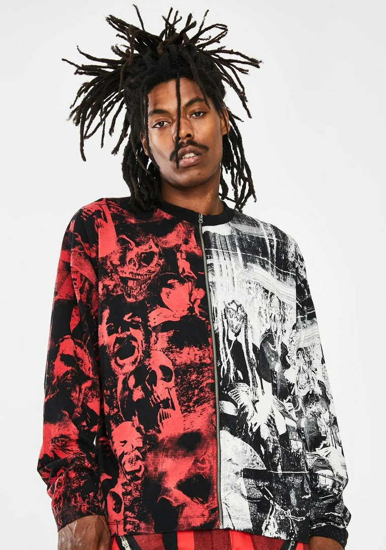 cuz you don’t give a fuq! Go against the grain in this long sleeve zip-up t-shirt with a spliced punk print all ova N’ a relaxed fit.