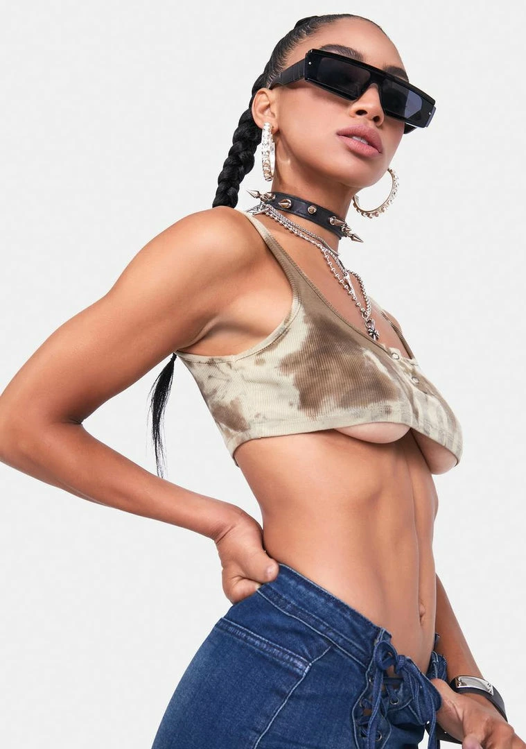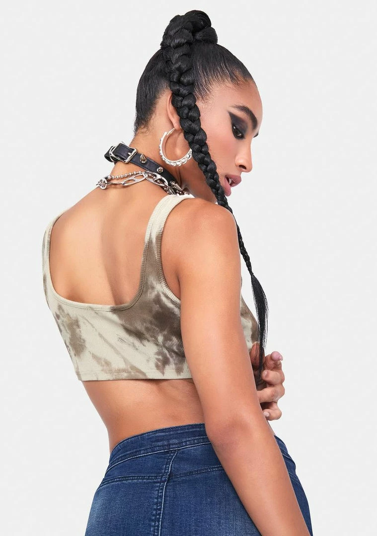 cuz you only rep the realest. This ribbed bralette top has a tie dye pattern all over, popper button details, and logo graphics on the front.