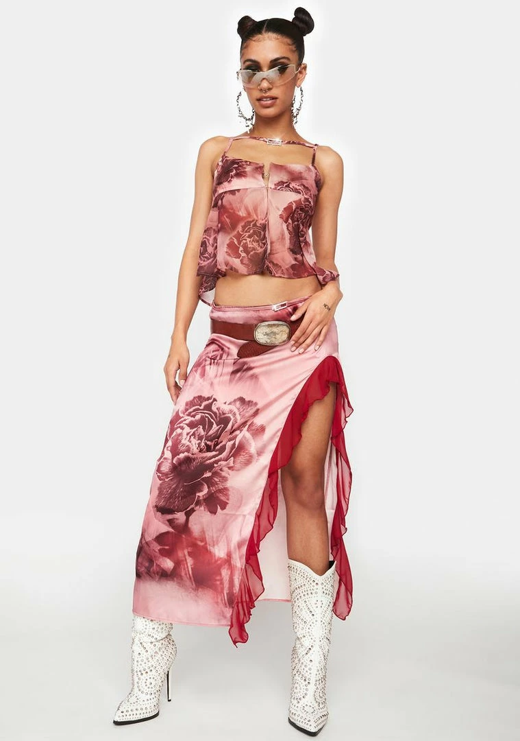 cuz you’re a classic beauty. This 00’s cami tank top has a square neckline with a rhinestone buckle detail, hook and eye closures on the front with a split design, and a noisette dusk rose print all over.