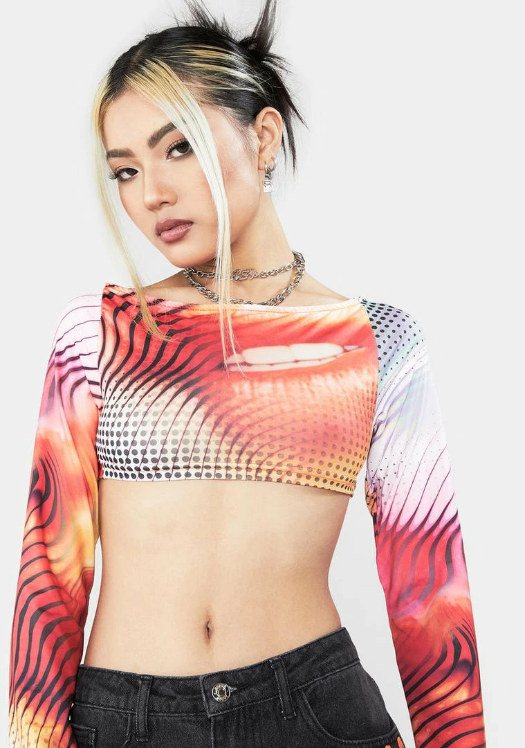 can you keep a secret? This long sleeve crop top has a backless design, adjustable straps, and a trippy lips print all over.