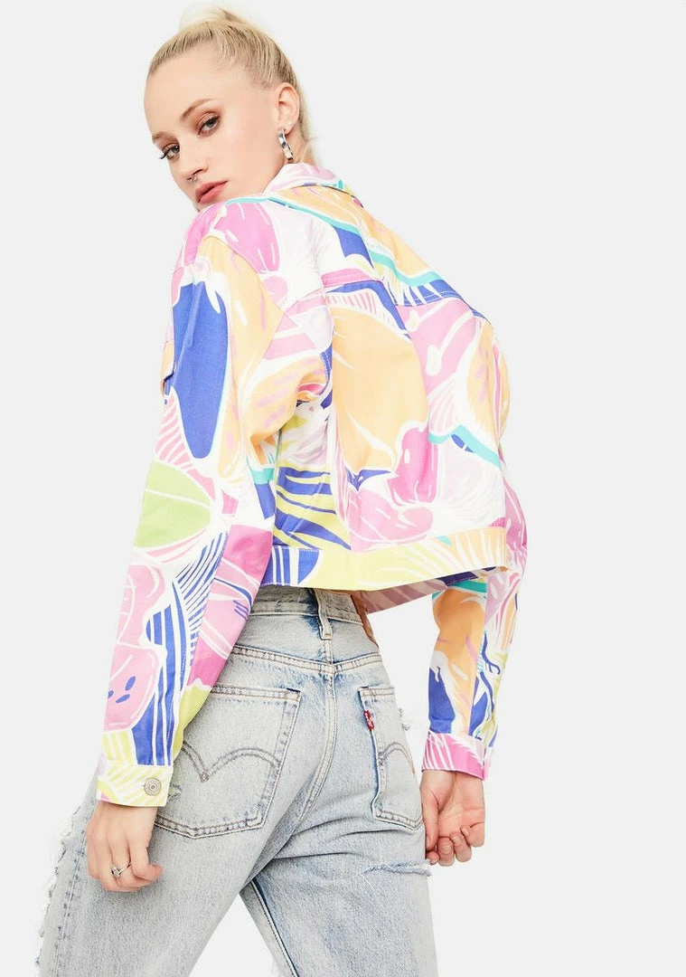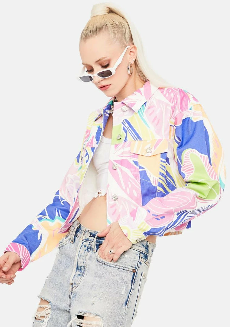 has a relaxed fit, a cropped silhouette, two chest pockets, button up closures, and a bright floral print all over.