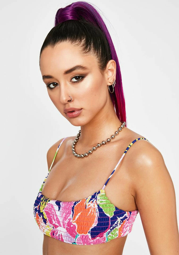 cuz youΓ’ΒΒre a bold babe! Stay commanding attention in this floral print shirred bikini top with a cropped fit and square neckline.
