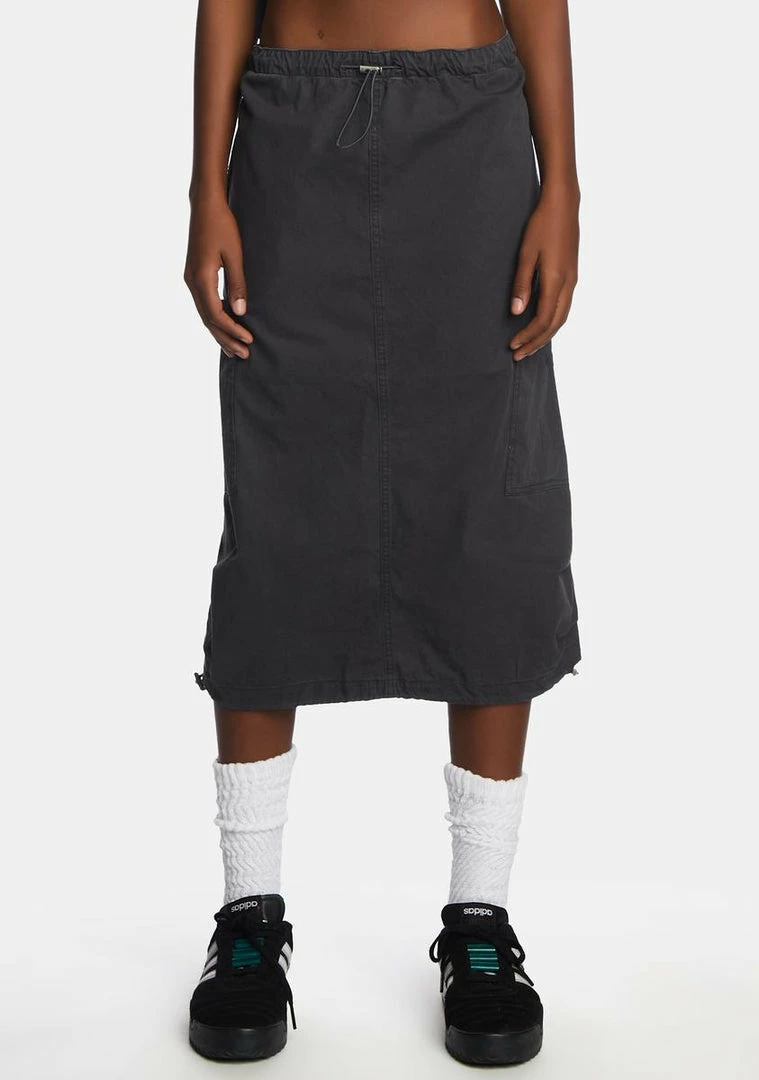cuz you’re the envy of their eye. This parachute cargo midi skirt has an adjustable toggle cord waistband, pockets on the sides, and adjustable toggle cords at the hem.